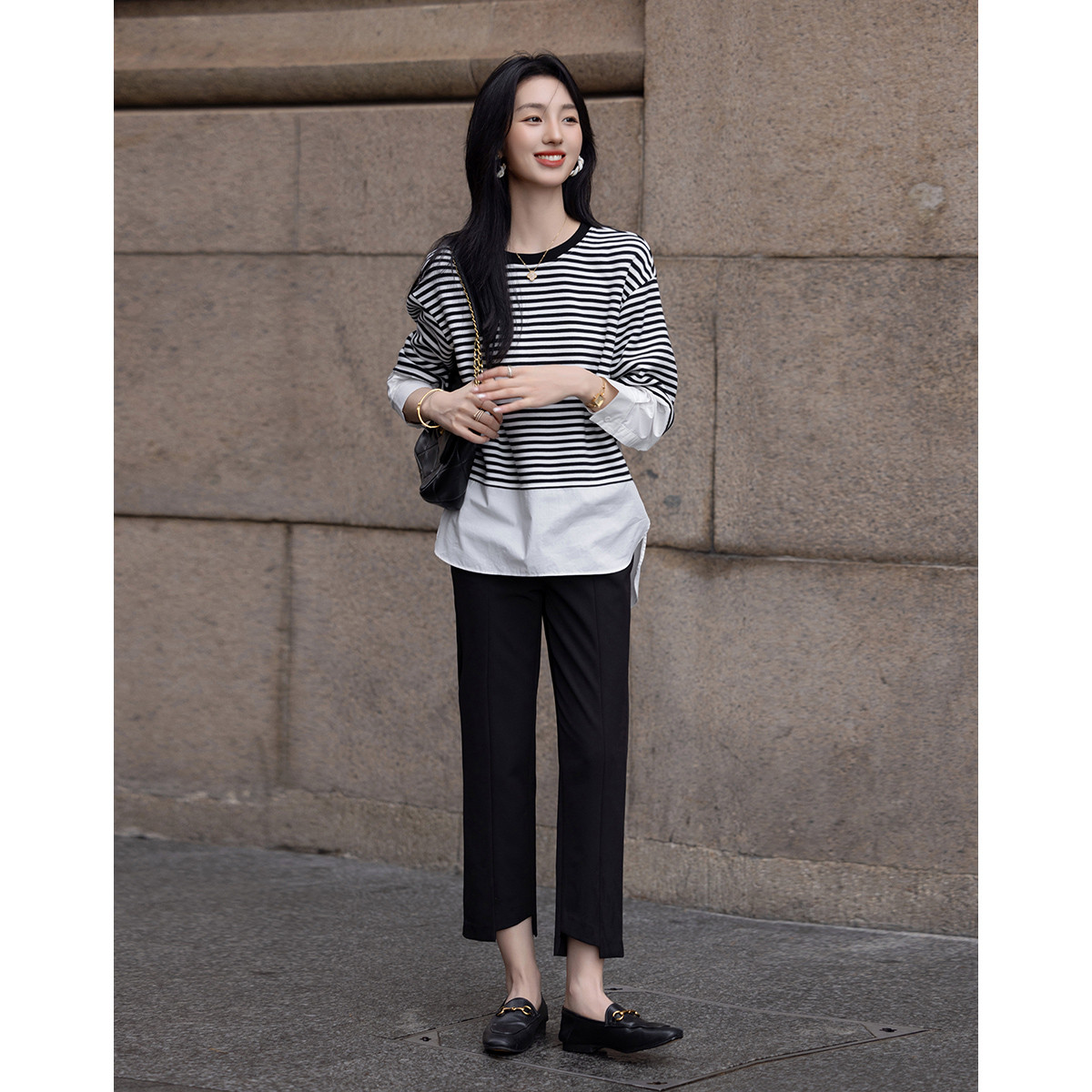 【线条美学】春秋美式复古条纹拼色时髦遮肉高频好搭长袖女式t恤 989633