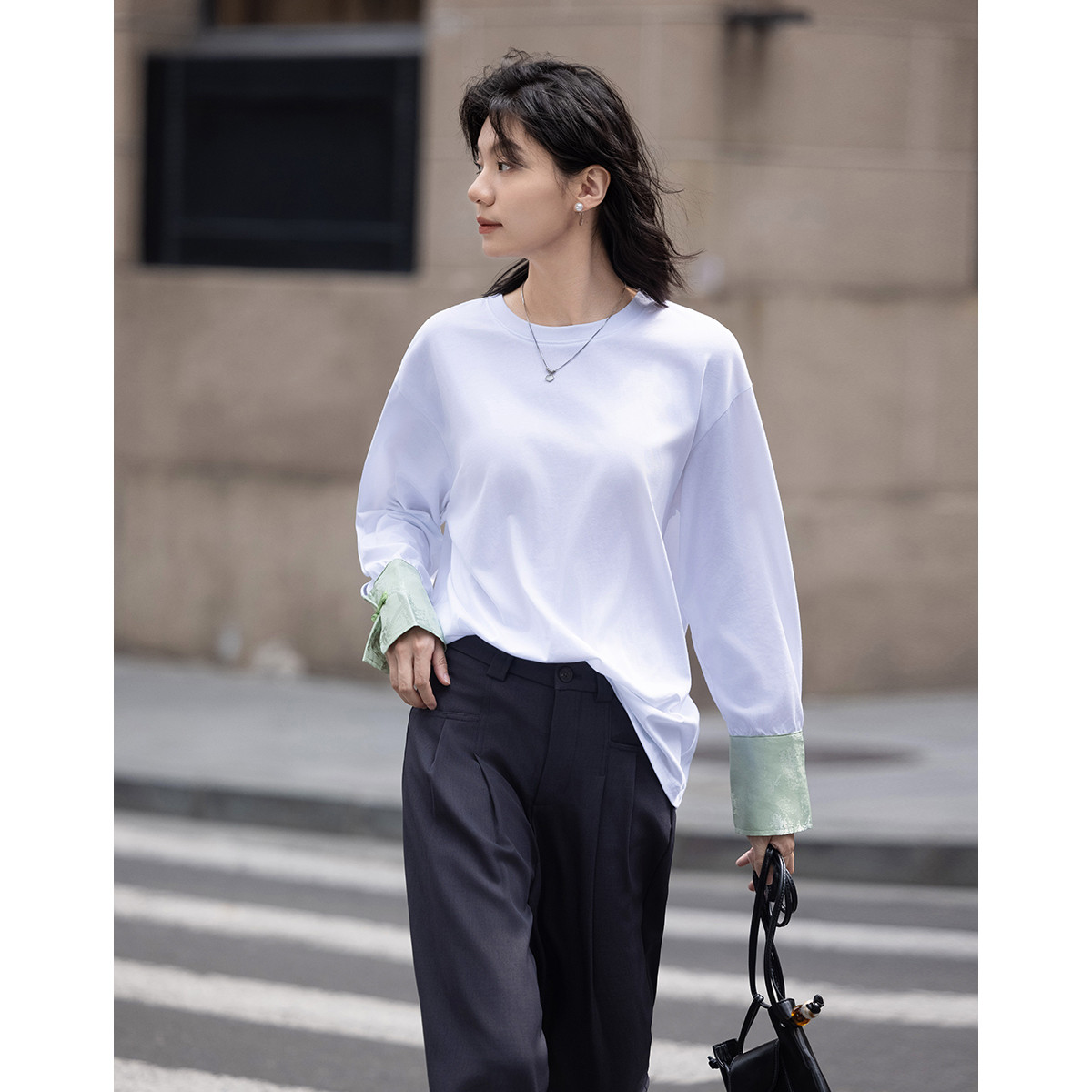 【新中式圆领T恤】秋优雅清秀绿拼接袖口个性简约上衣女 225794