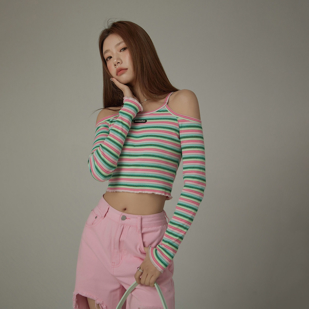圆领露肩条纹长袖T恤女春夏纯欲打底衫上衣 957075