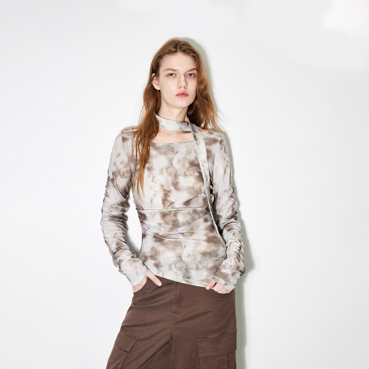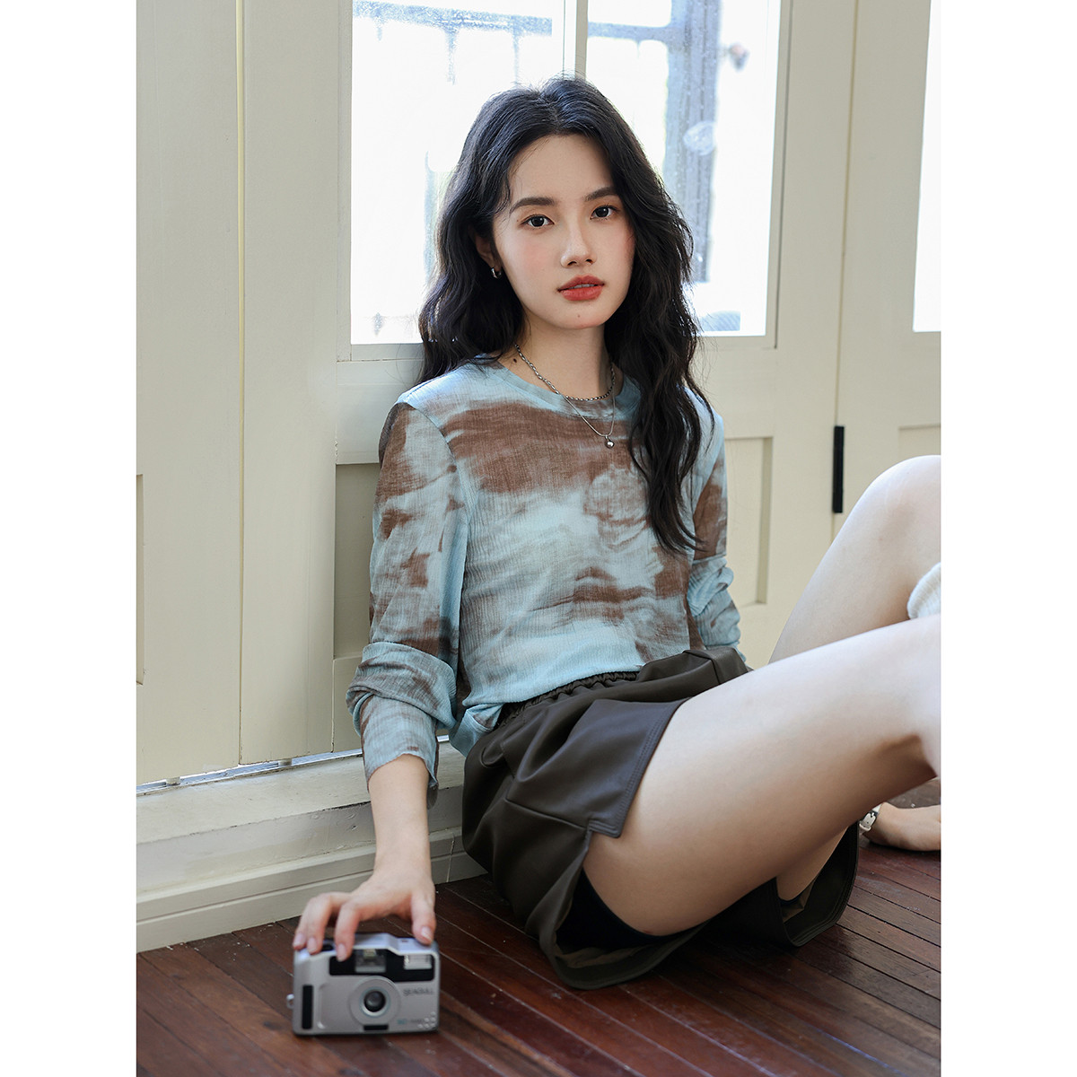 【晕染微透网纱打底衫】春秋大理石纹理网纱高级感长袖打底T恤女 438721