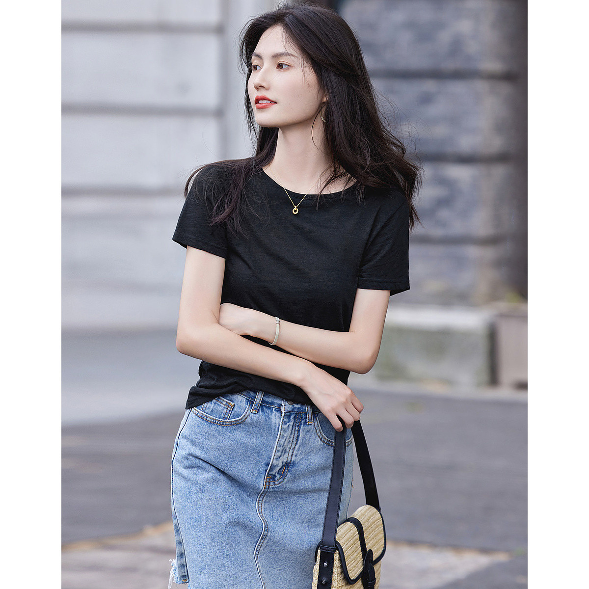 【简而不凡】轻薄款夏圆领修身短袖弹力清凉休闲女式t恤 666433