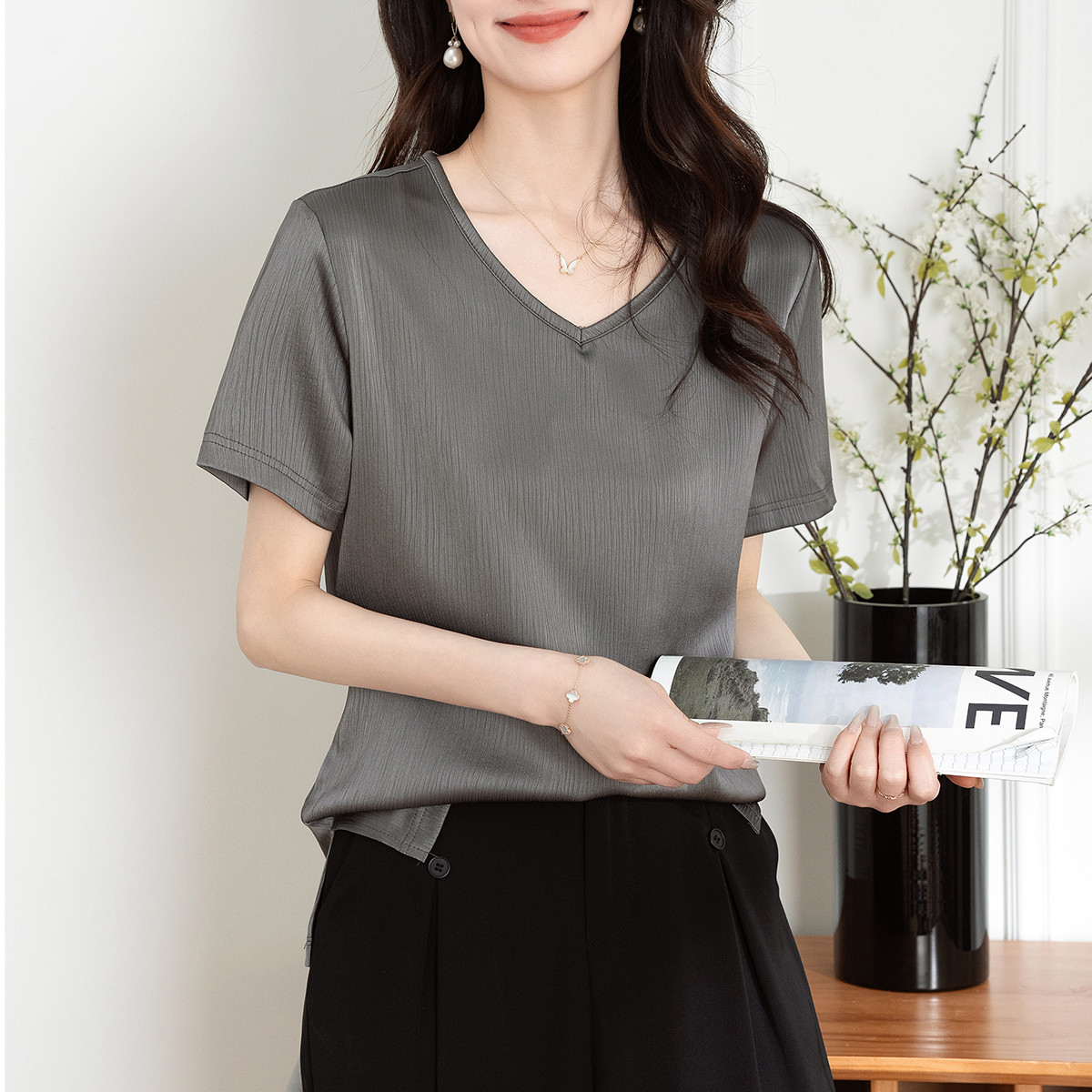 时尚两边开叉夏季V领短袖T恤女休闲百搭舒适透气纯色气质上衣女 443265