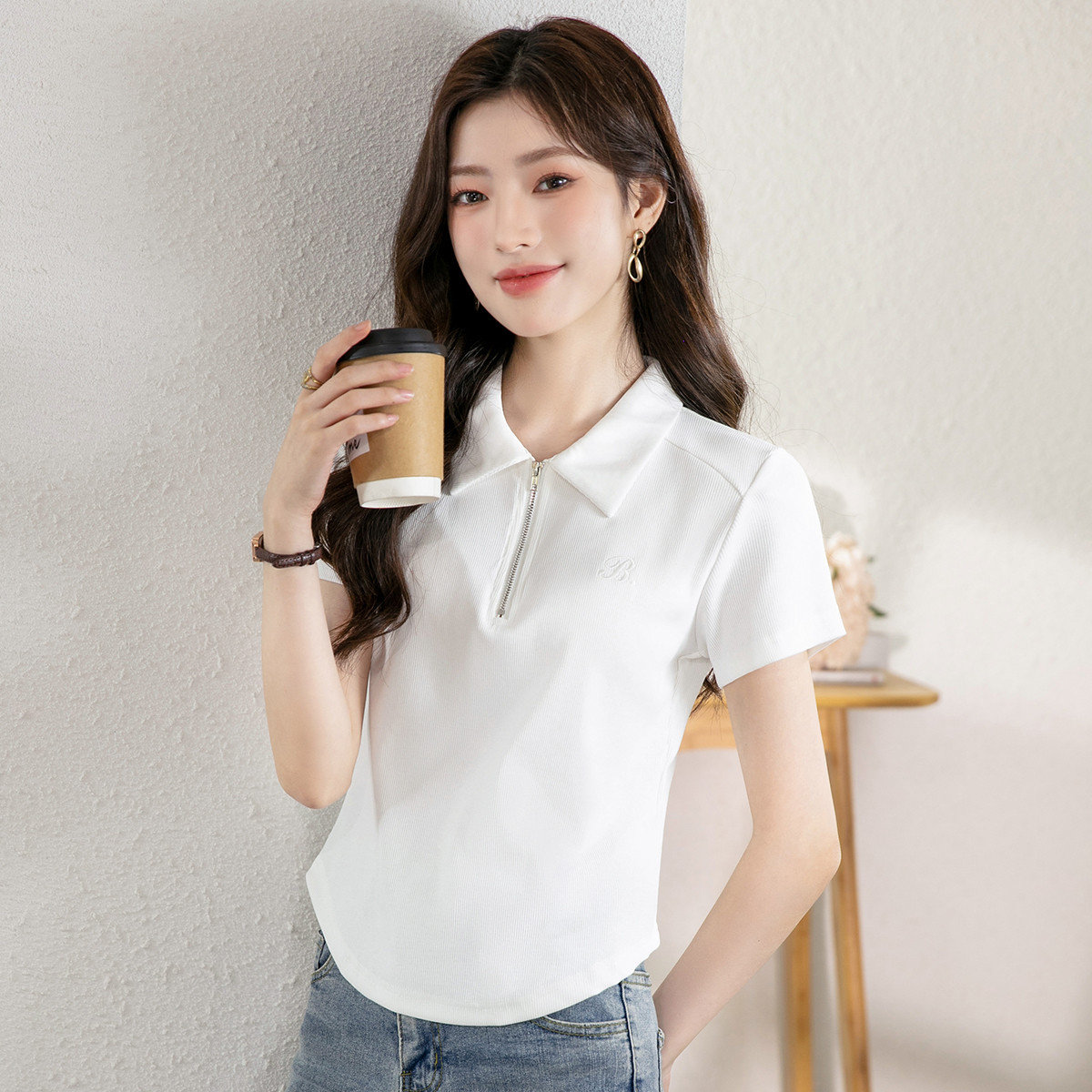 夏季休闲舒适时尚纯色翻领半拉链设计短袖T恤女上衣潮 768024