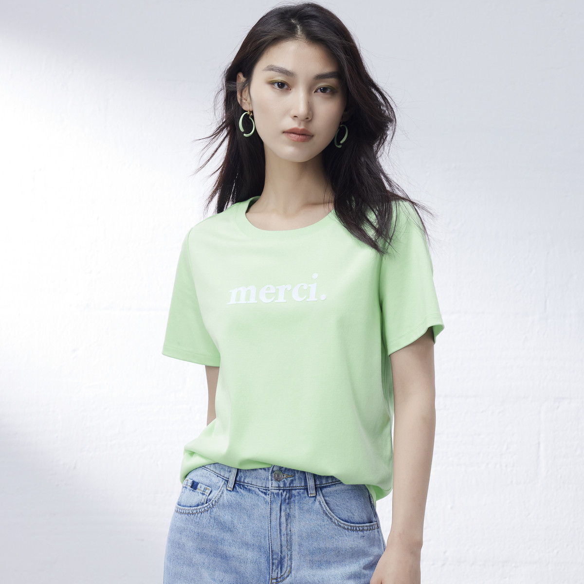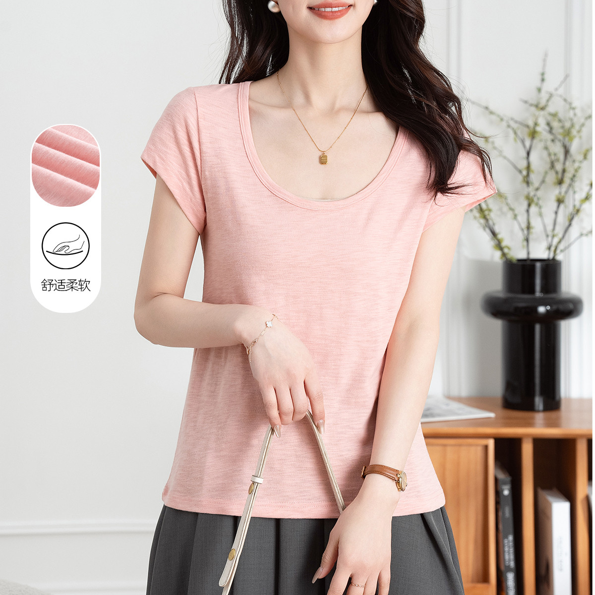【100%棉】U领夏季短袖T恤女宽松透气简约百搭气质纯色上衣 291713
