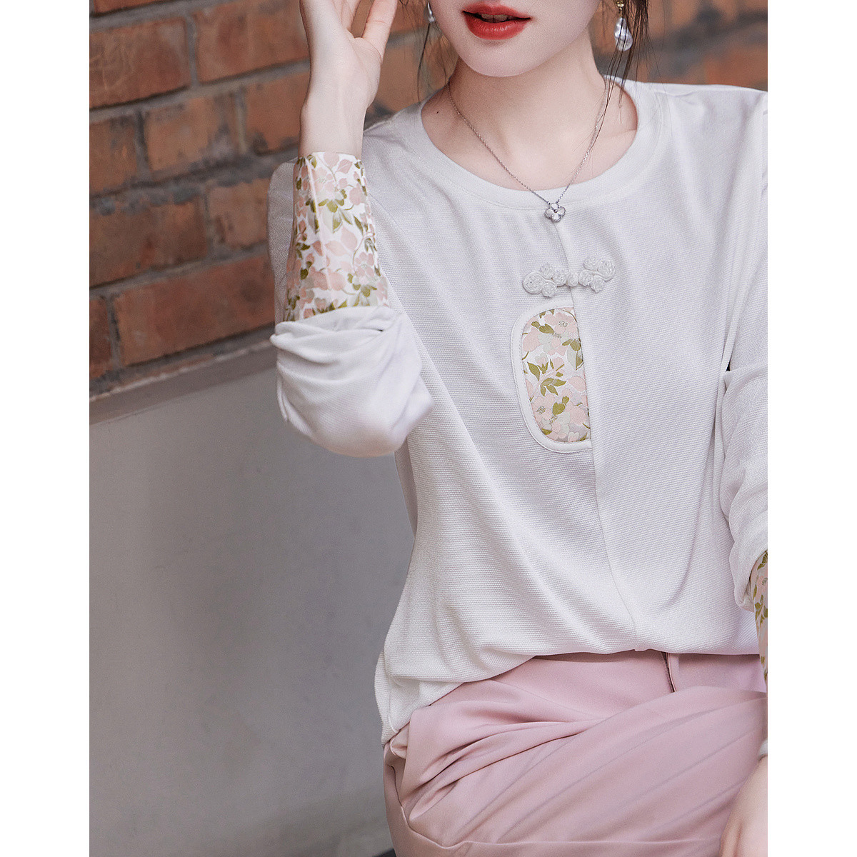 【人间白月光】秋国风新中式光感仿醋酸珠地盘扣半圆装饰女式t恤 448833