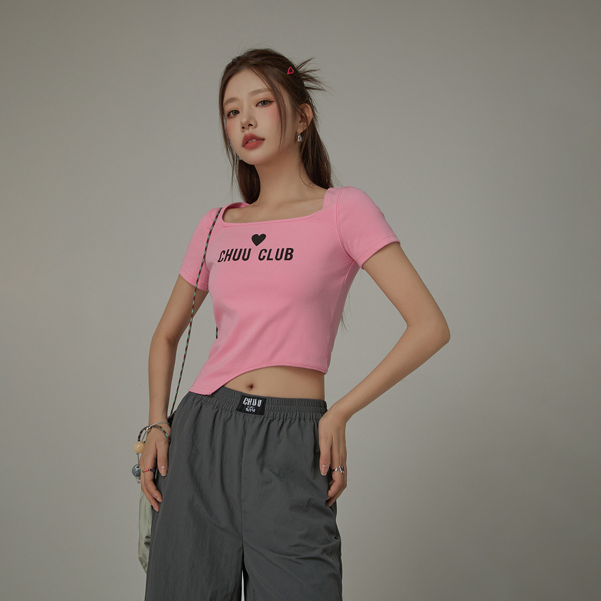 CHUU系带镂空T恤女秋设计感V领辣妹短款上衣 374867
