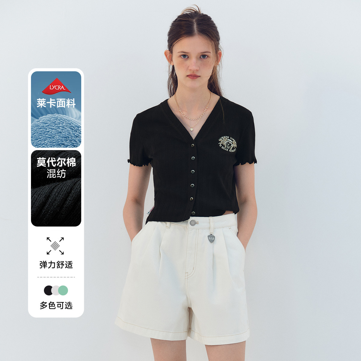 小熊夏季莱卡弹力V领短袖T恤开衫莫代尔混纺女装上装 677441