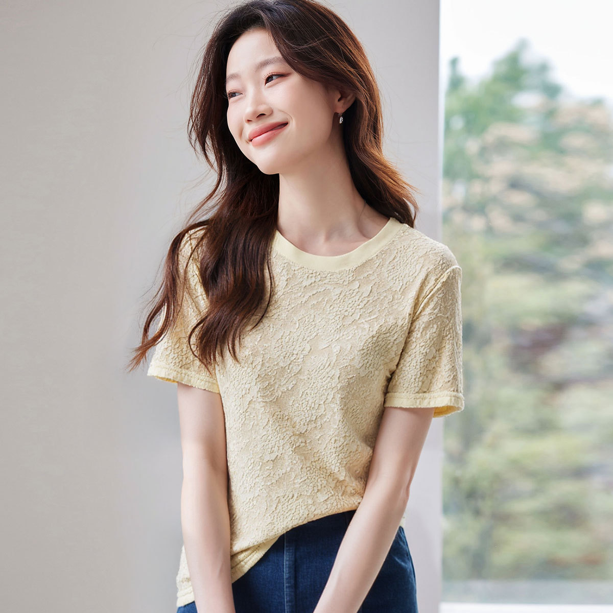 夏季圆领高级感复古提花纹理感短袖气质蕾丝t恤衫上衣女 341535