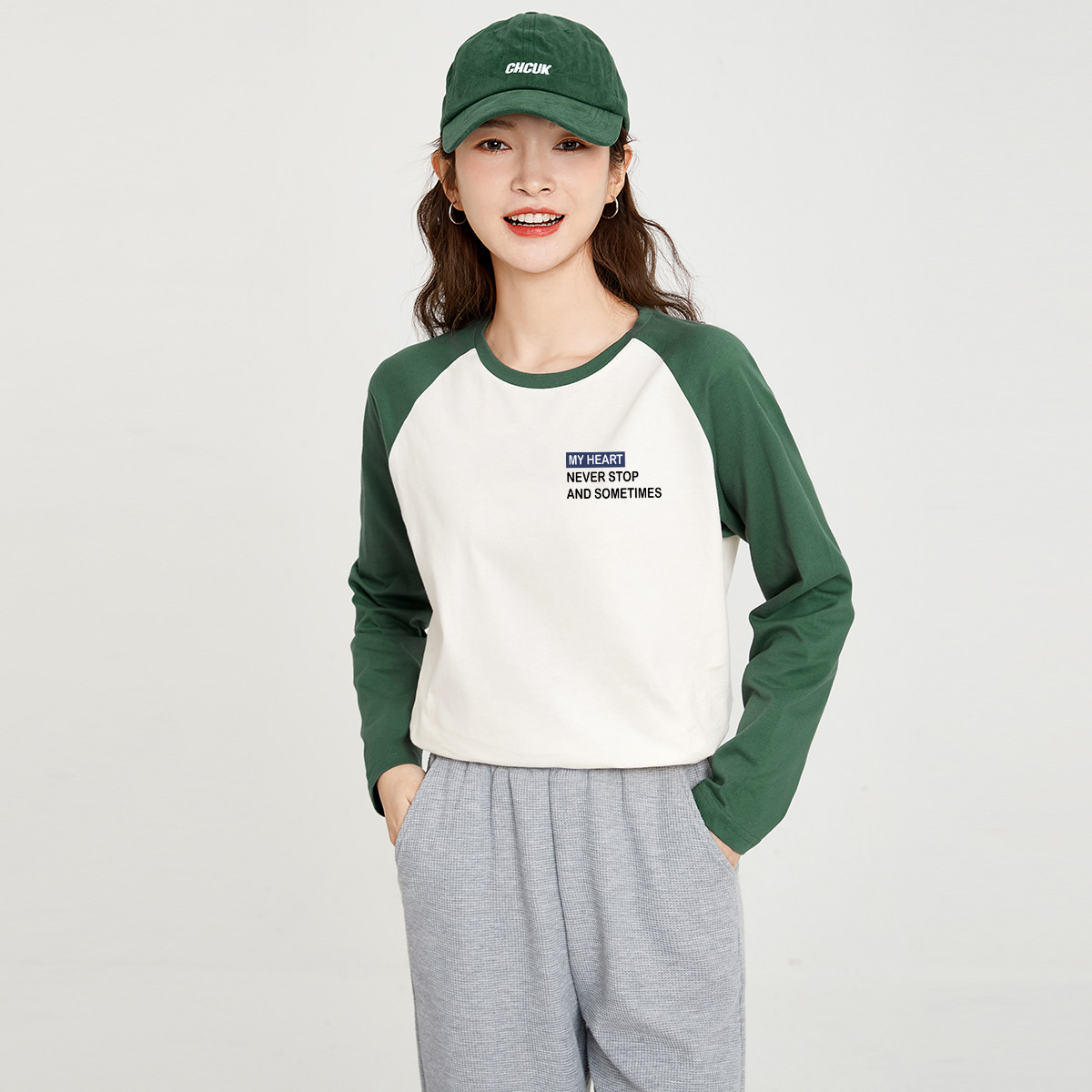 米子旗春秋季圆领字母印花女式T恤插肩袖设计宽松长袖上衣 708634