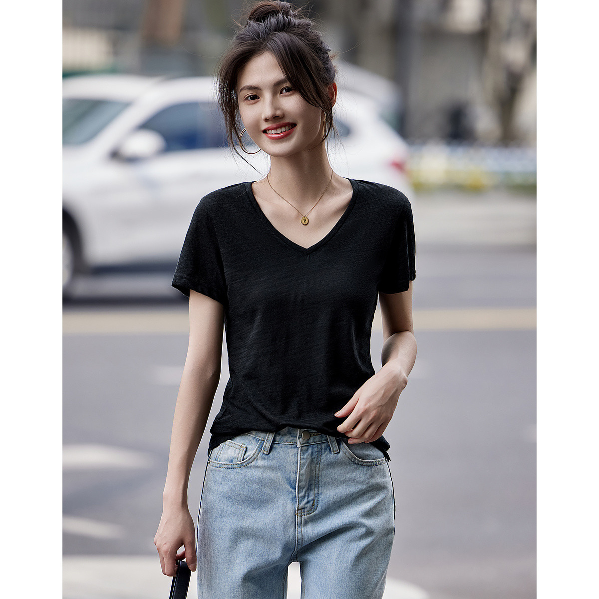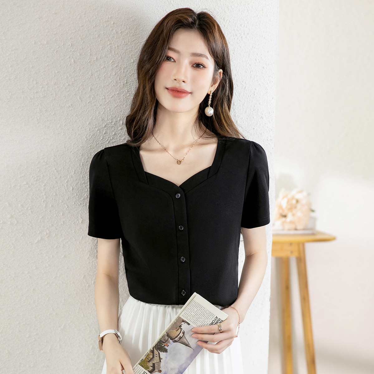 【静奢风通勤】夏轻熟风桃心领清凉薄款短袖简约女式t恤 592705
