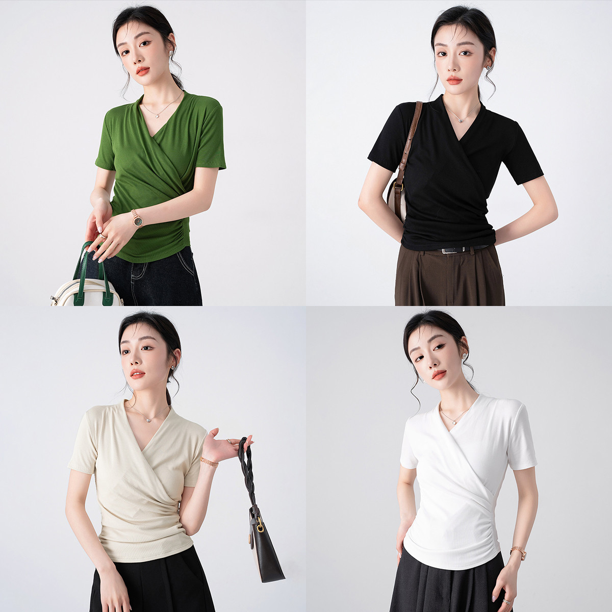 纯色V领交叉短袖T恤女夏季设计感褶皱收腰修身显瘦上衣 136536