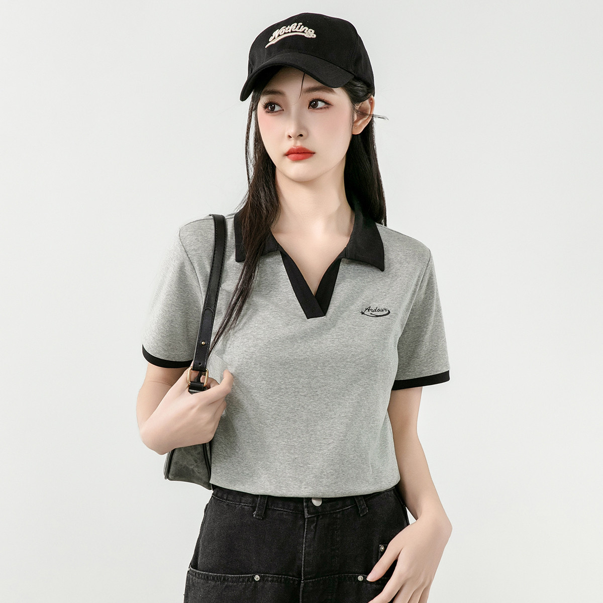 夏季时尚撞色绣花POLO领休闲舒适短袖T恤女 777496