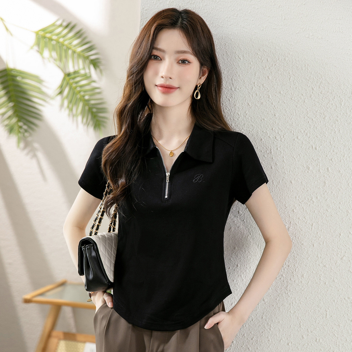夏季休闲舒适时尚纯色翻领半拉链设计短袖T恤女上衣潮 829464