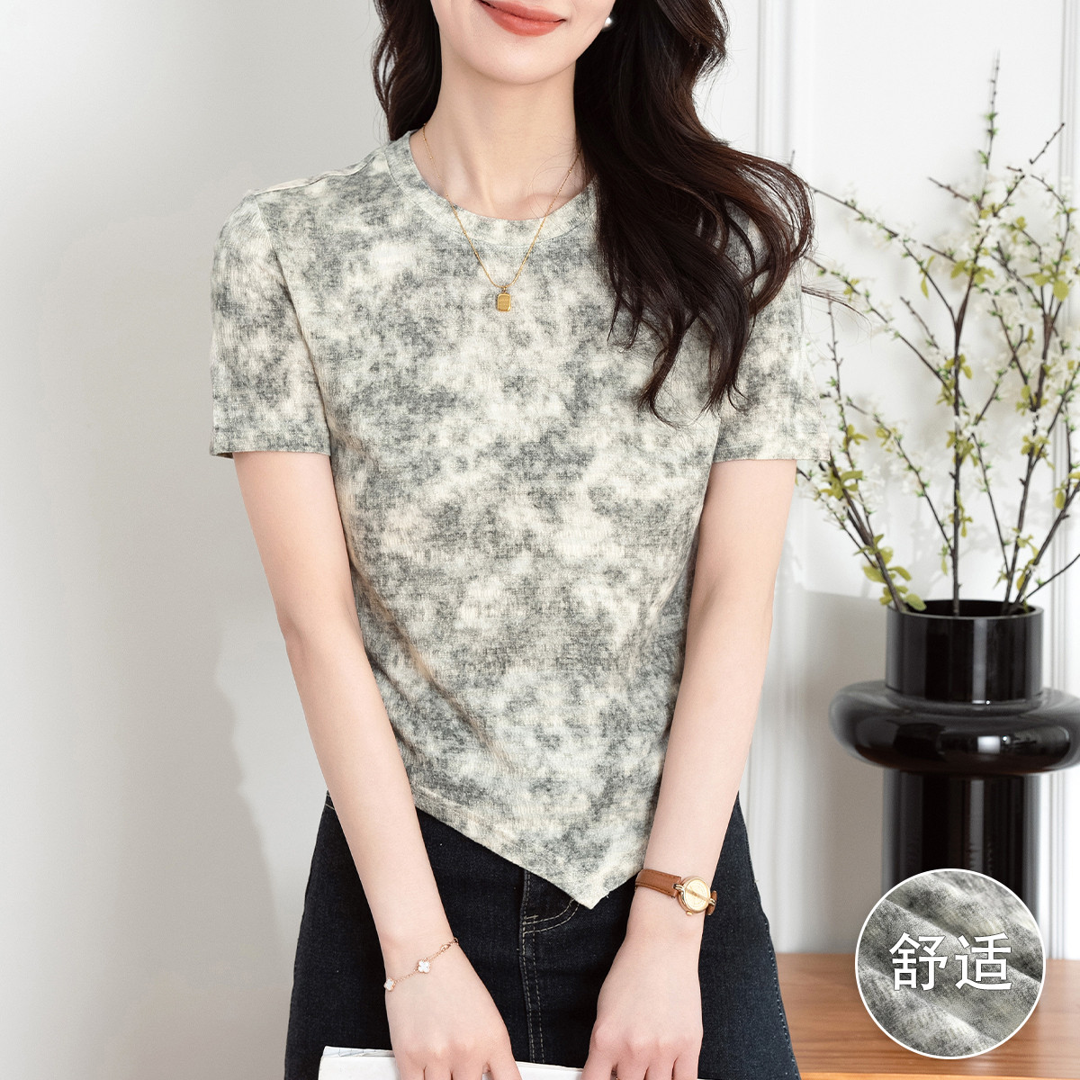 夏季女式t恤设计感印花休闲百搭时尚短袖t恤女式体恤衫上衣 930264