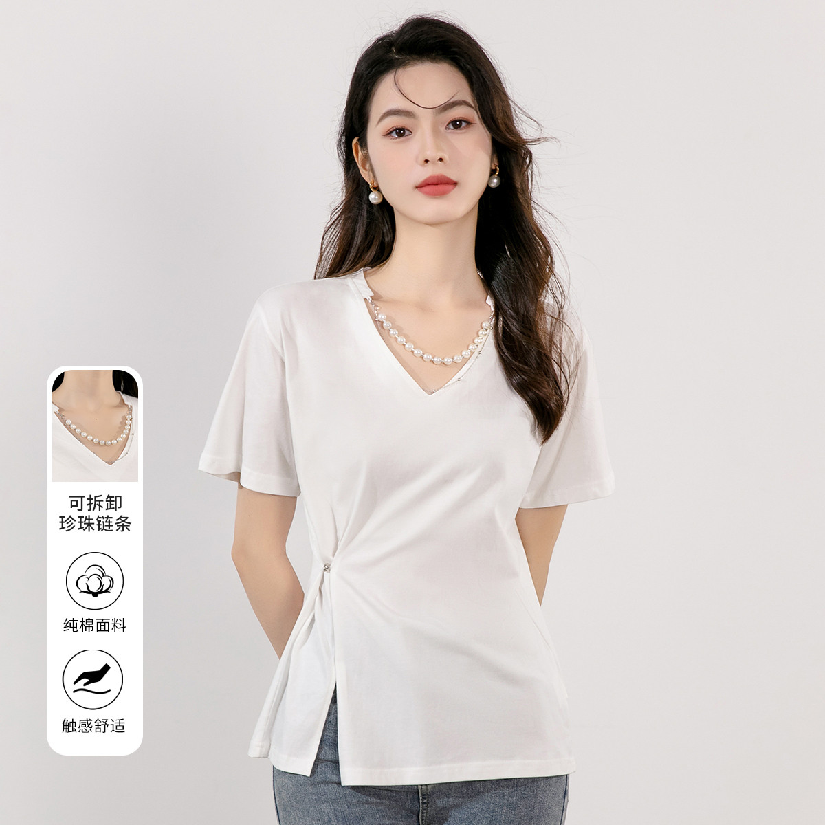 时尚两边开叉夏季V领短袖T恤女休闲百搭舒适透气纯色气质上衣女 283521