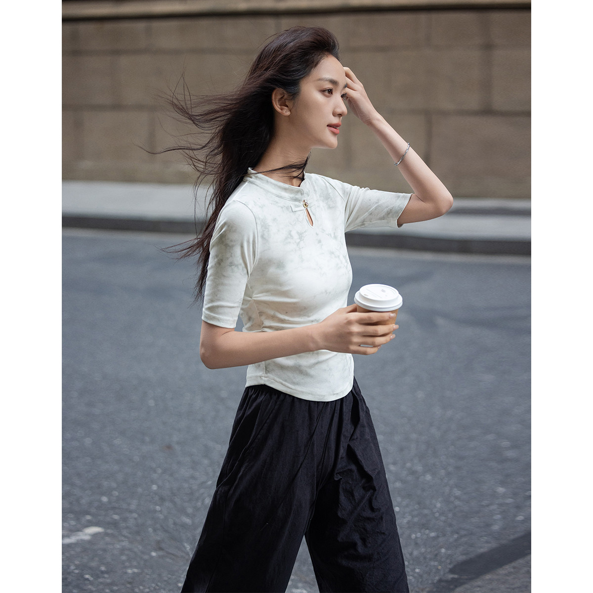 【新中式立领短袖】夏层次晕染盘扣装饰中袖T恤女 200642