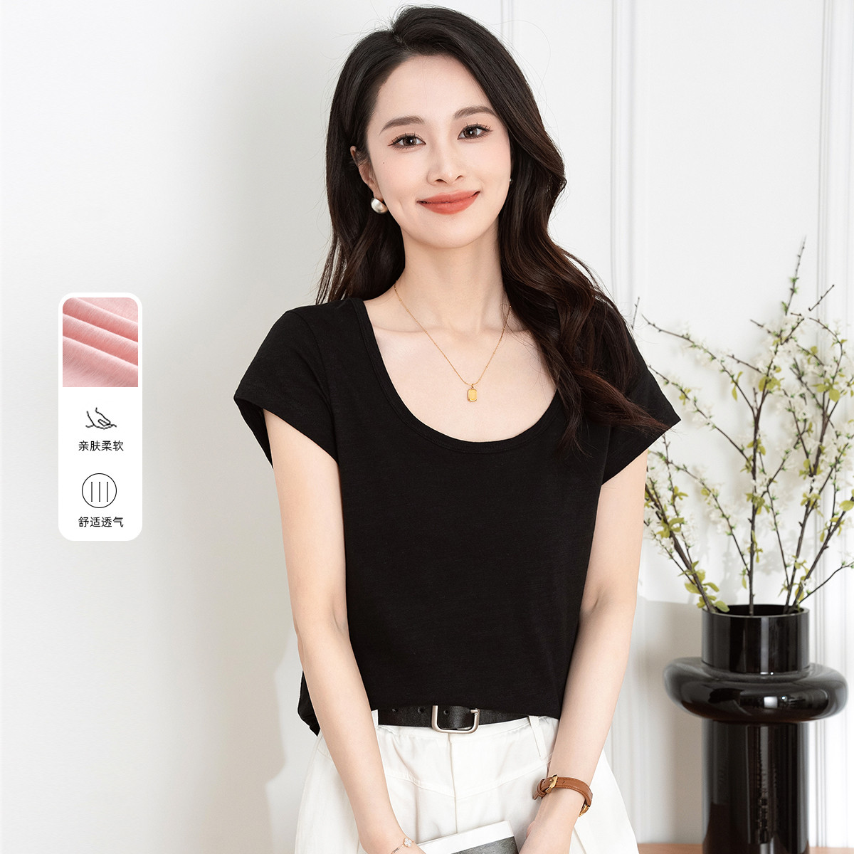 【100%棉】U领夏季短袖T恤女宽松透气简约百搭气质纯色上衣 430977