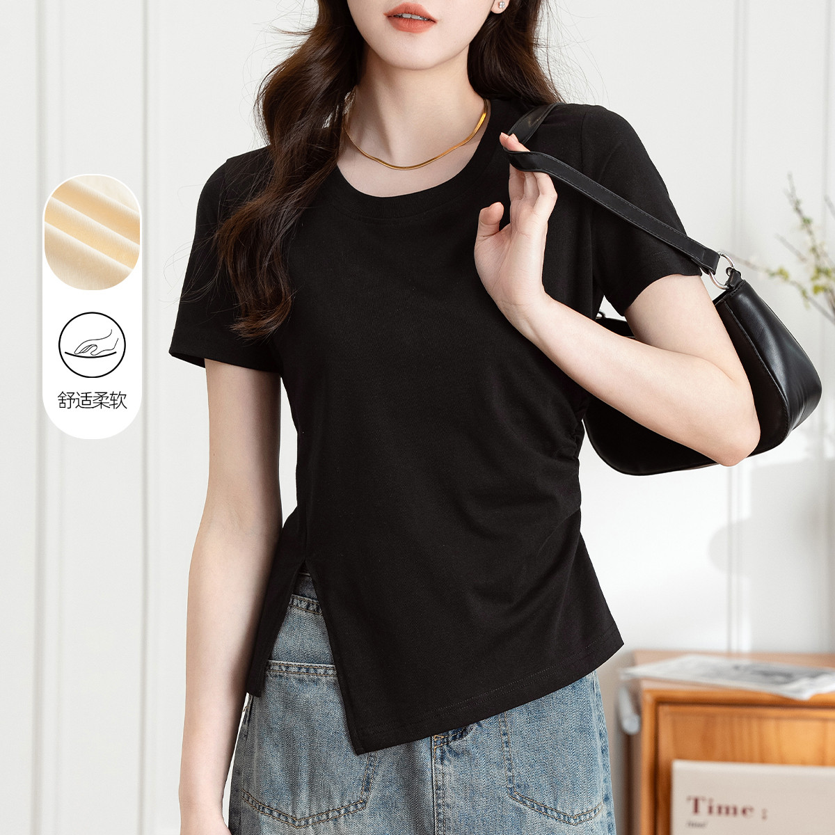 【100%棉】时尚潮流不规则开叉褶皱夏季纯色休闲短袖T恤女潮 733249
