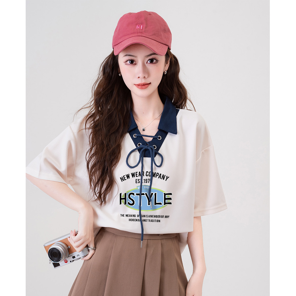 撞色翻领绑带设计感小众时尚短袖上衣潮流百搭t恤女式T恤 376139