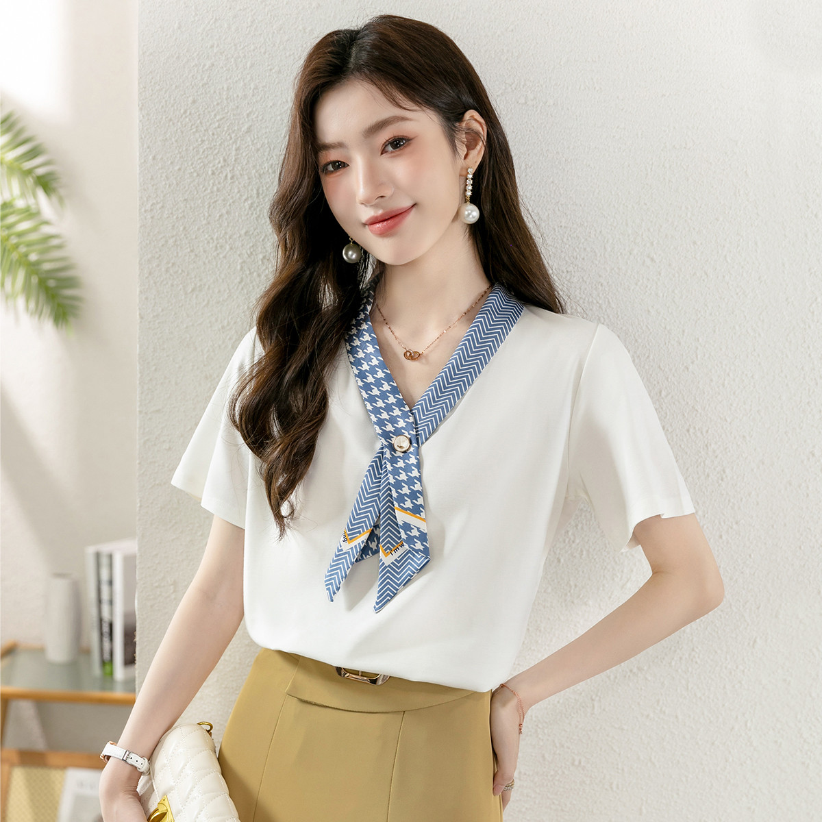 【丝带设计感】V领纯色休闲舒适短袖T恤女上衣夏季 757784