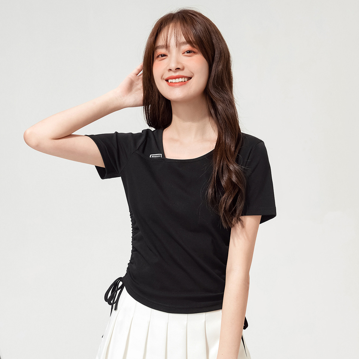 休闲舒适不规则大领口短袖t恤女韩版修身显瘦性感抽绳上衣 678360