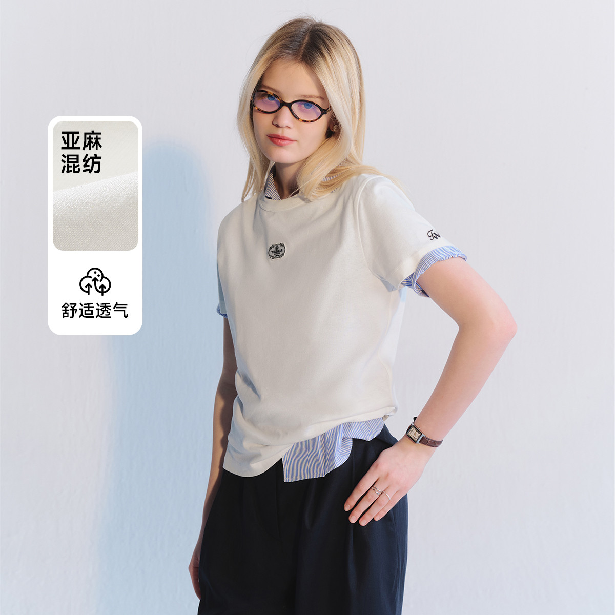 【棉+亚麻】小熊夏季职场通勤简约圆领纯色白色T恤女 412865