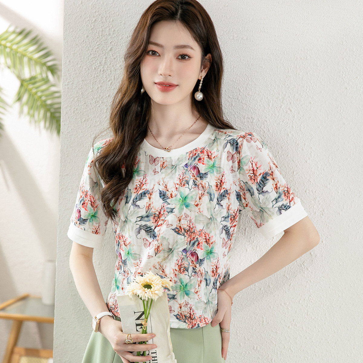 【创意印花女式t恤】夏季圆领打底衫花朵印花休闲短袖t恤女上衣 800792