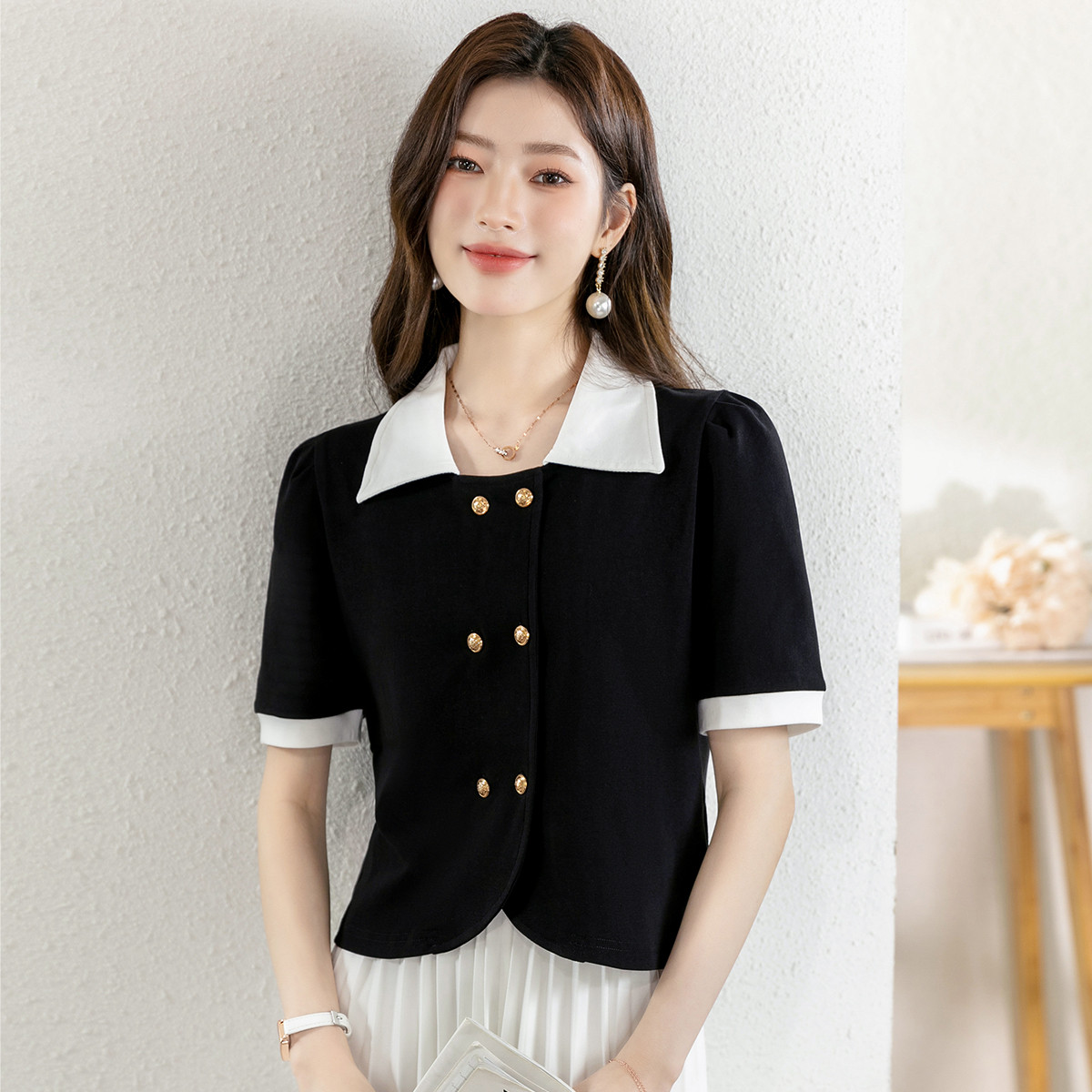 【泡泡袖设计】POLO领休闲撞色纽扣装饰短袖T恤女上衣潮 495448