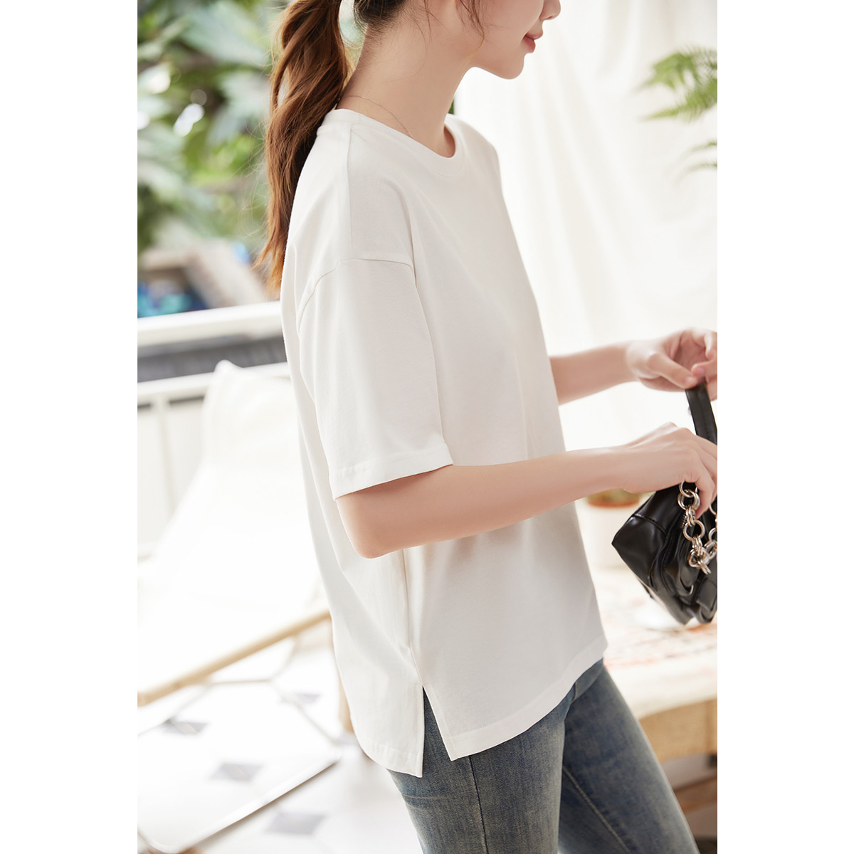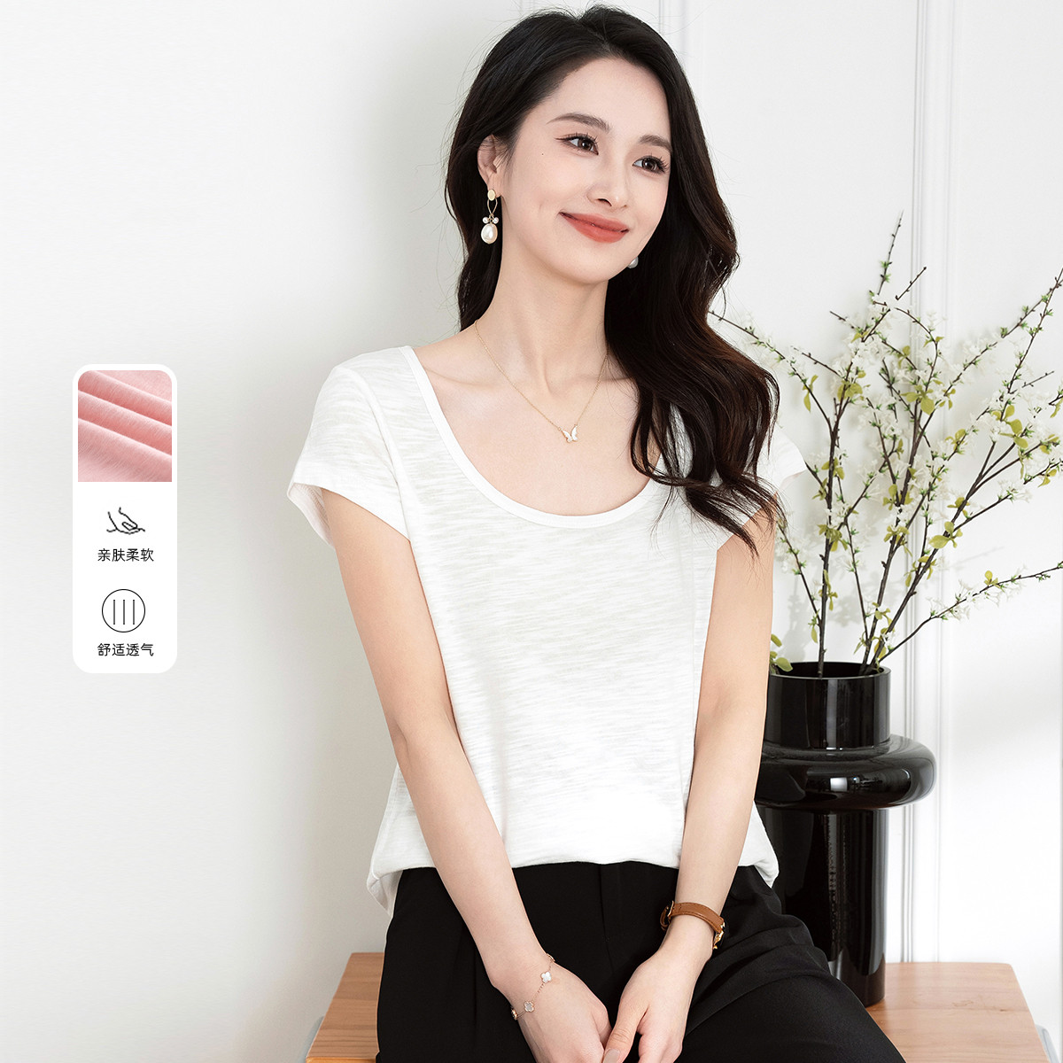 【100%棉】U领夏季短袖T恤女宽松透气简约百搭气质纯色上衣 242561