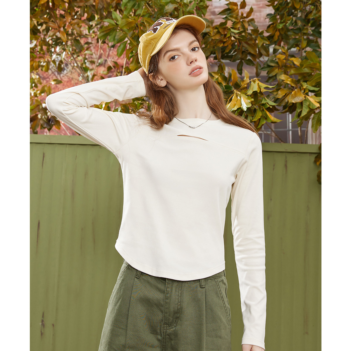 米子旗春秋款圆领女式T恤纯色宽松下摆开叉设计长袖上衣 544474