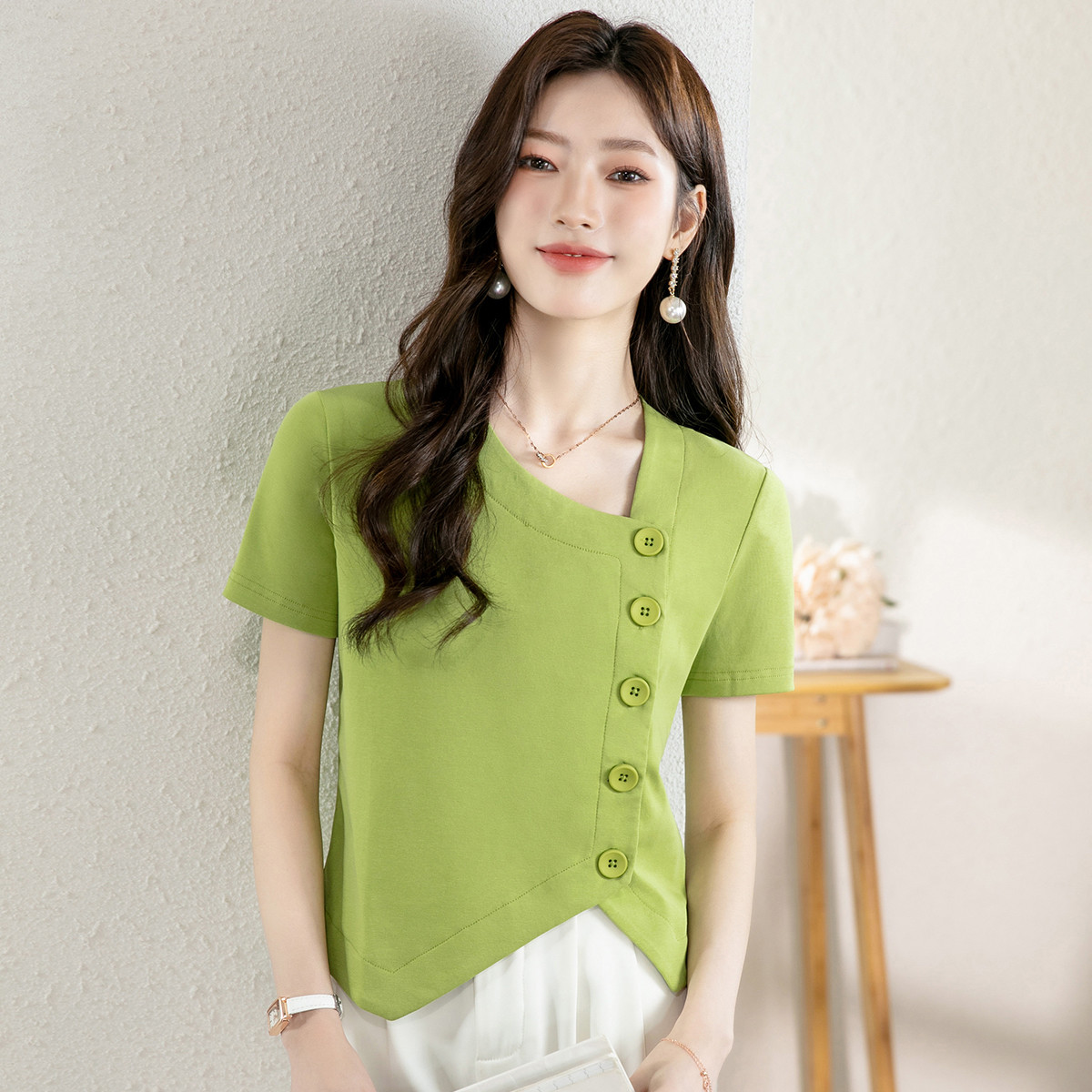 【斜领纽扣不规则设计】夏季休闲时尚短袖T恤女上衣潮流 643544