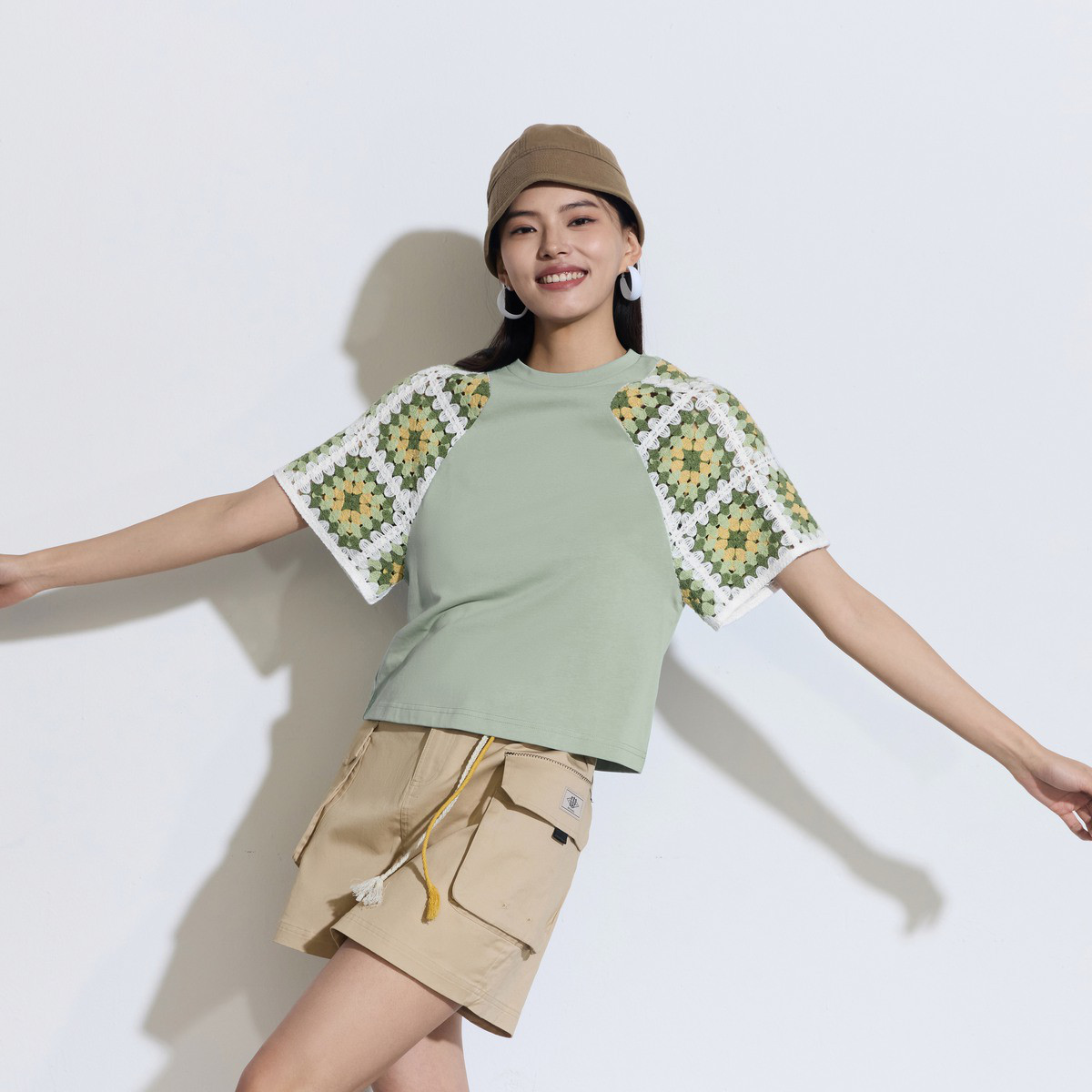 Gap女装夏季洋气拼接钩花短袖T恤宽松时尚圆领上衣874528 262170