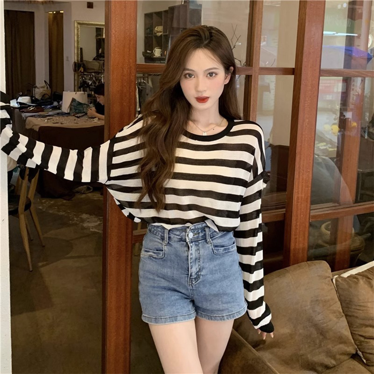 圆领薄款条纹宽松空调服慵懒风针织上衣女外穿长袖t恤女 090371