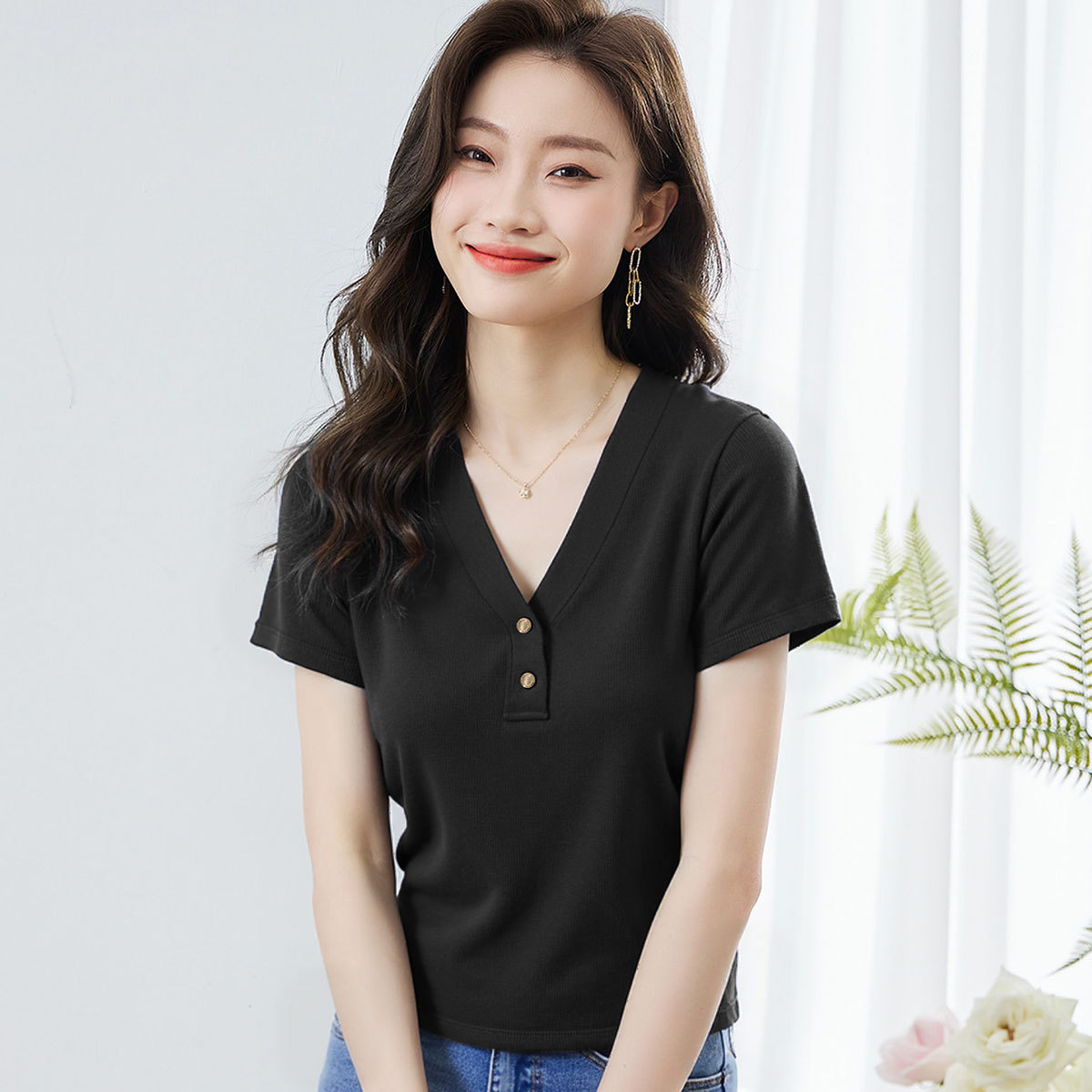 纯色V领短袖女t恤高级感夏季正肩短款显瘦女t恤短袖上衣 456991