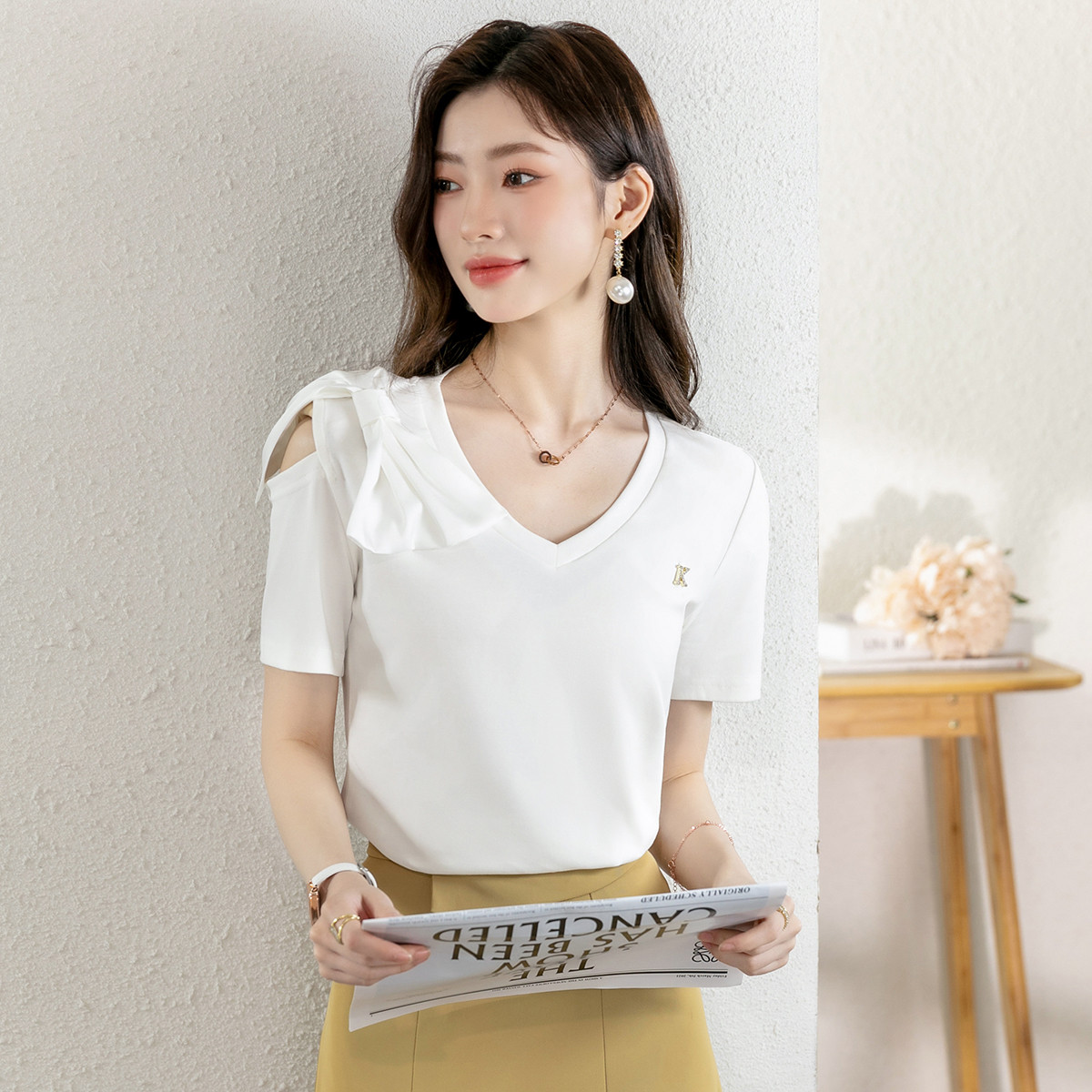 【蝴蝶结设计】夏季休闲舒适纯色百搭短袖T恤女上衣 446296