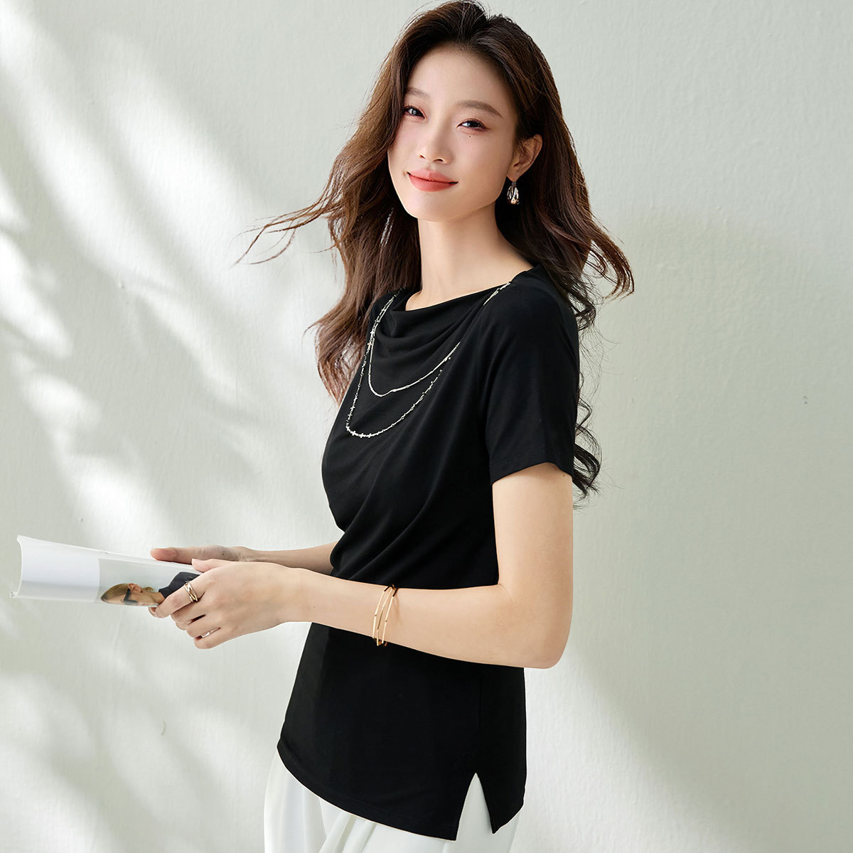 【轻柔莫代尔】法式别致设计感链条短袖t恤女夏季显瘦荡领t恤 813535