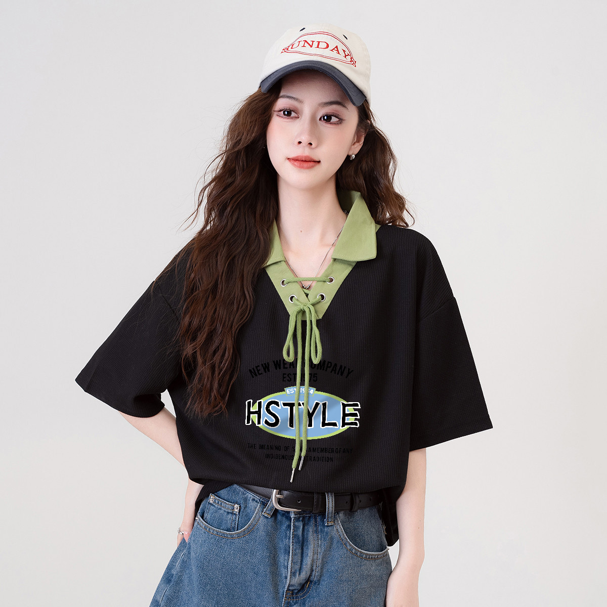 撞色翻领绑带设计感小众时尚短袖上衣潮流百搭t恤女式T恤 257355