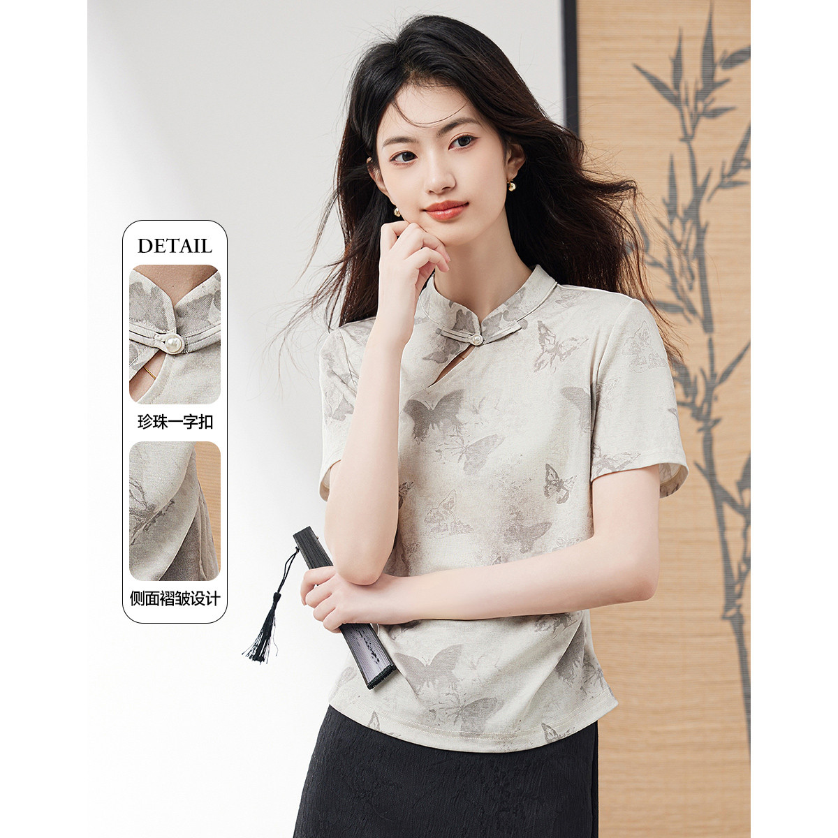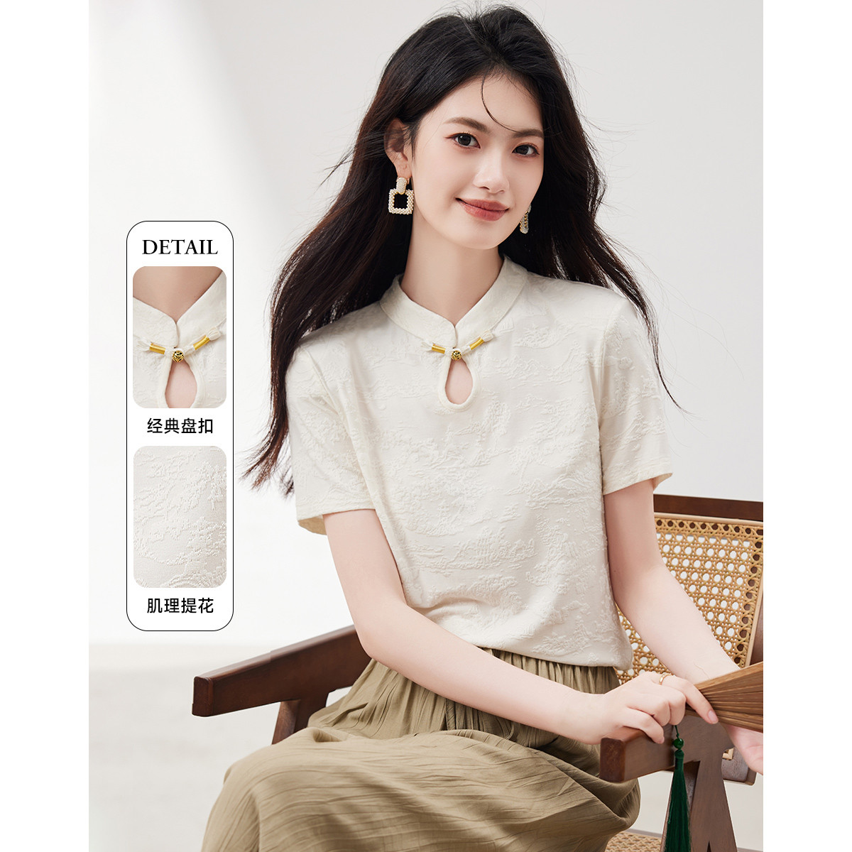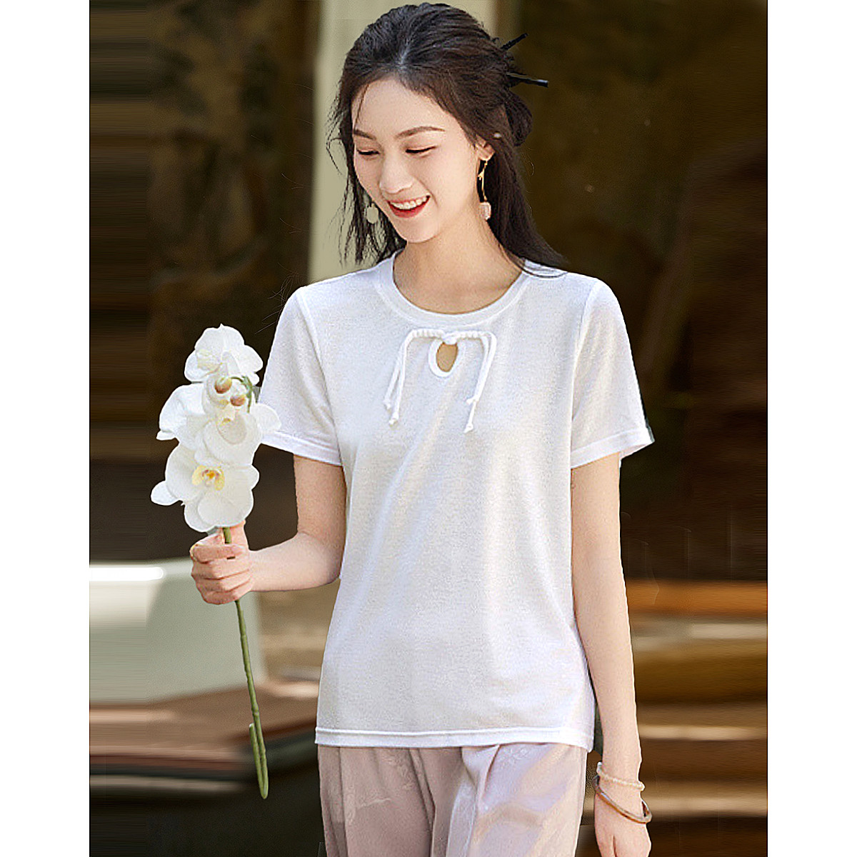 【薄荷曼波】夏国风新中式雅致圆领盘扣弹力舒适藏肉短袖女式t恤 506369