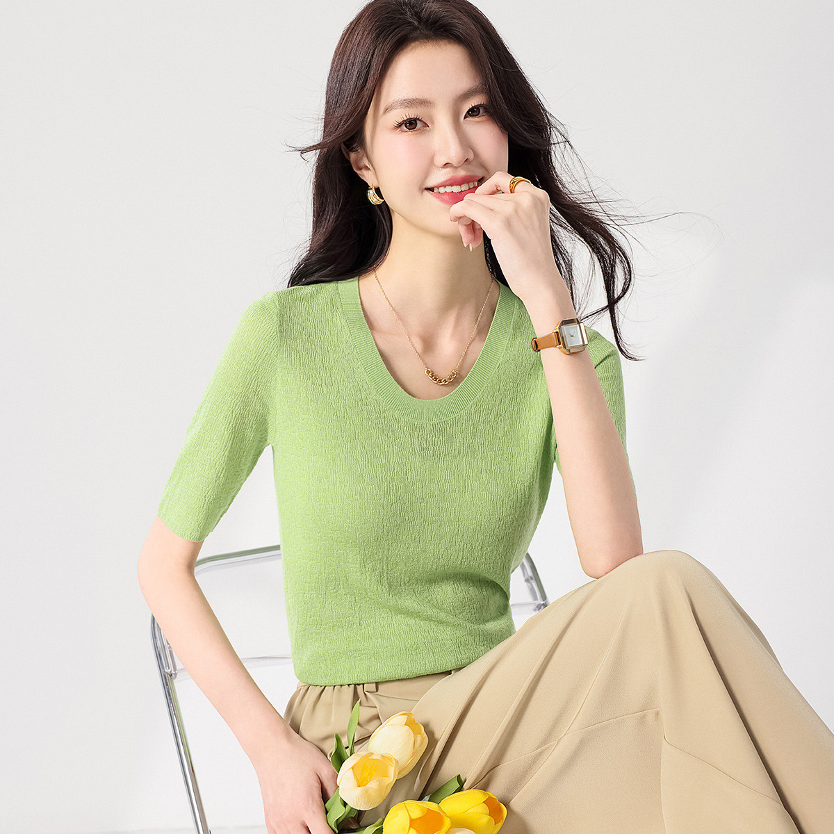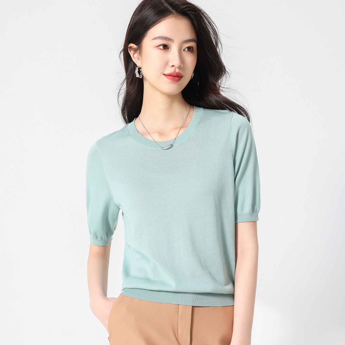 春夏轻薄透气简约百搭纯色圆领含桑蚕丝针织打底短袖T恤衫 141139