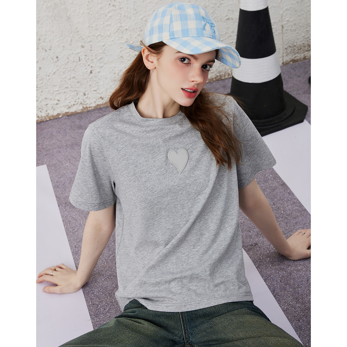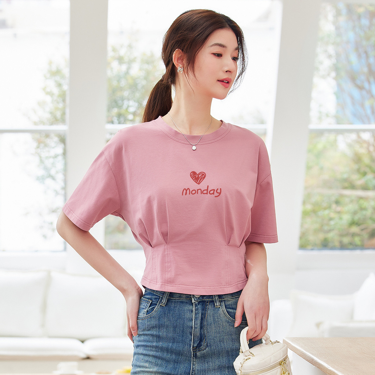 米子旗夏季圆领爱心印花女式T恤短款下摆收腰设计显瘦短袖上衣 692378