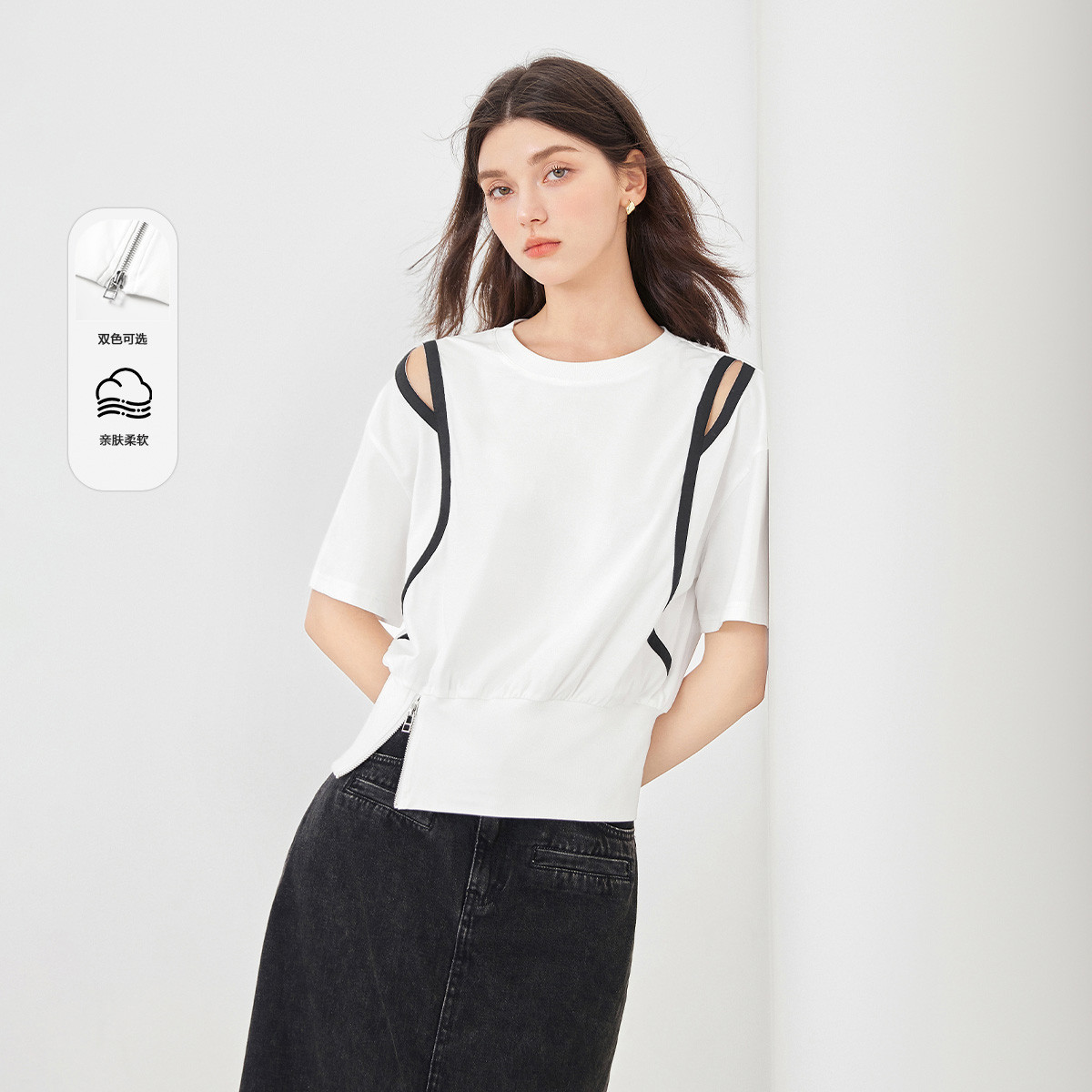 【2024夏季】小众设计感白色露肩开叉短袖T恤简约风女上衣 407188