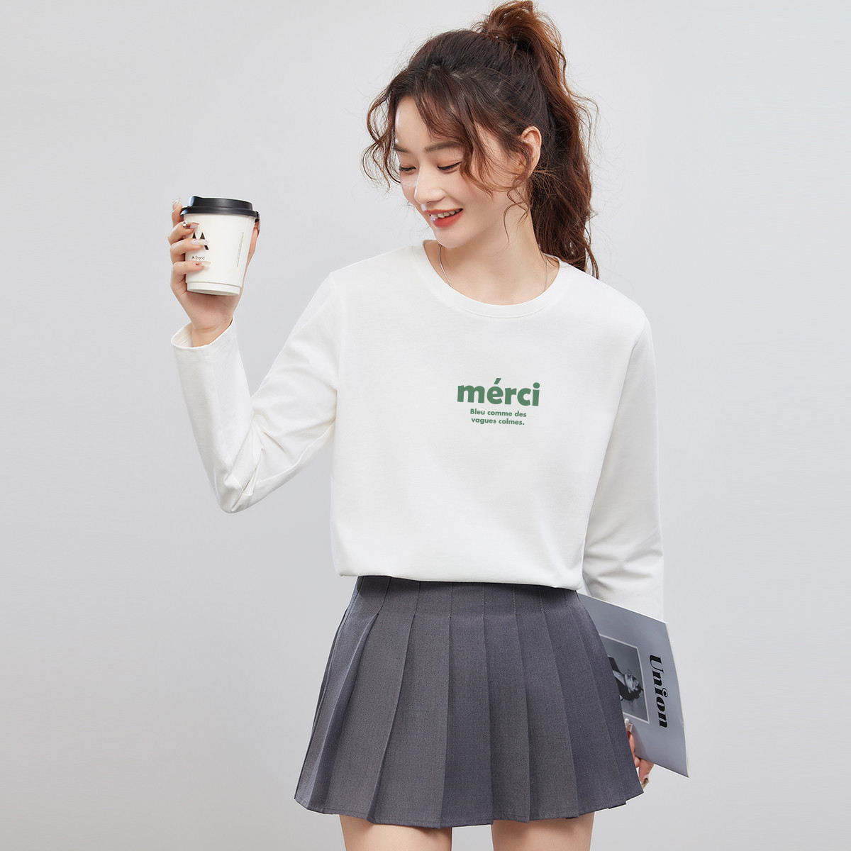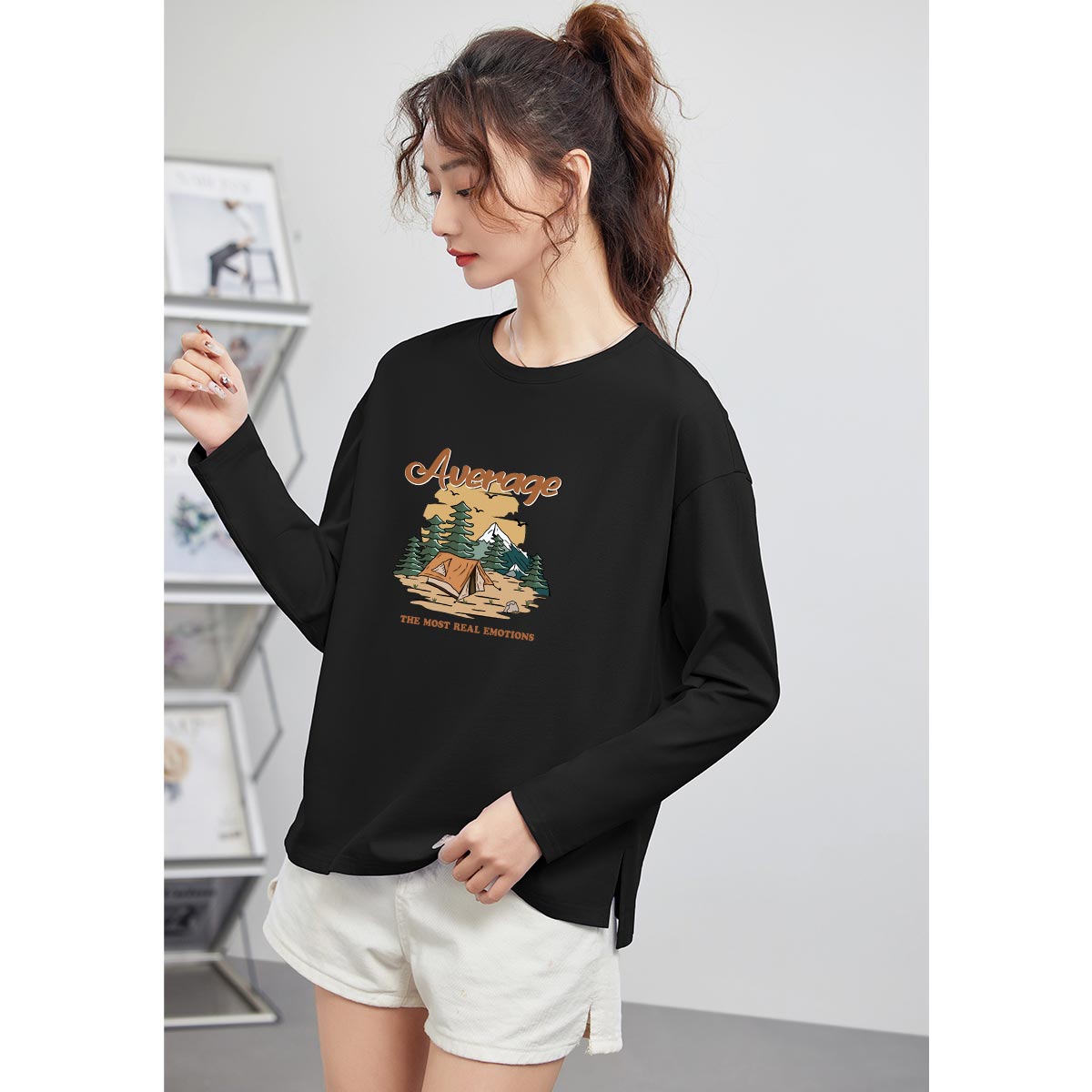 米子旗春秋季圆领印花女式T恤宽松简约休闲长袖上衣 799130