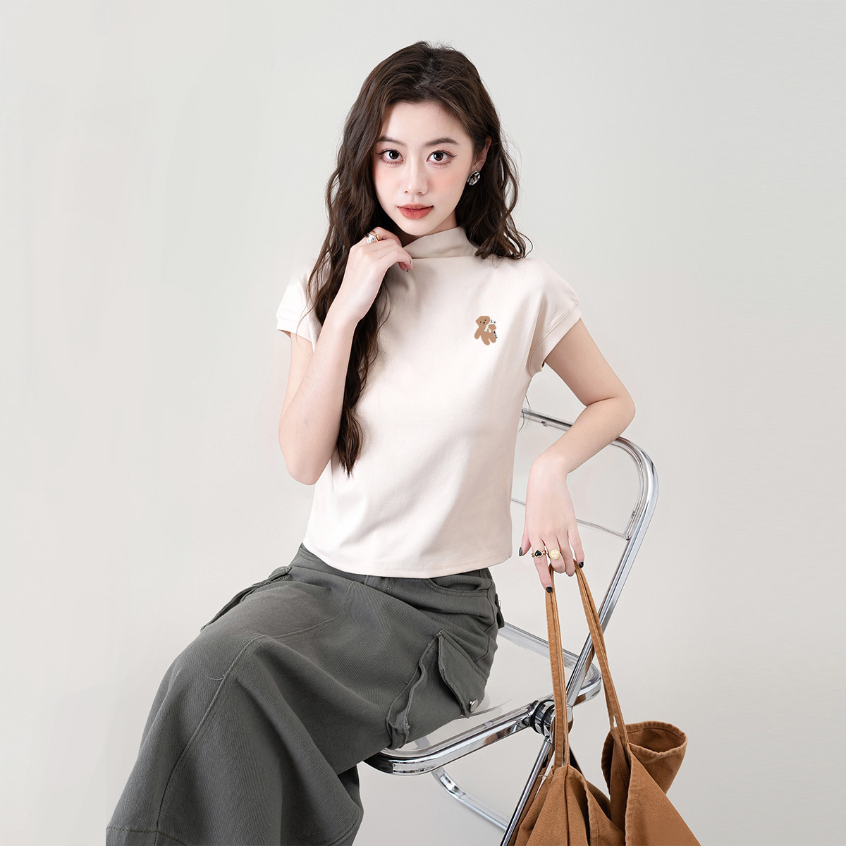 半高领小飞袖上衣印花舒适内搭春季款女式T恤休闲时尚 989067