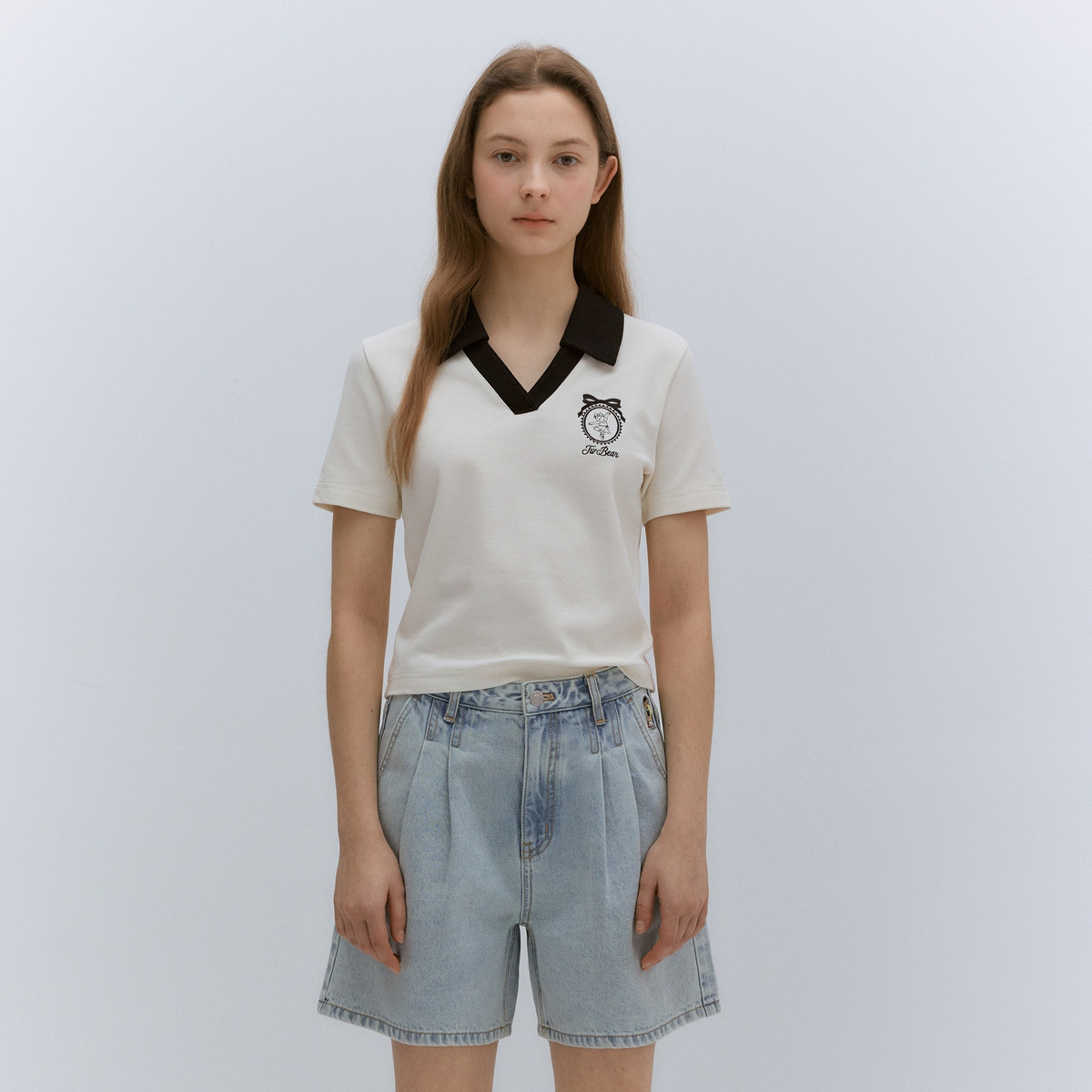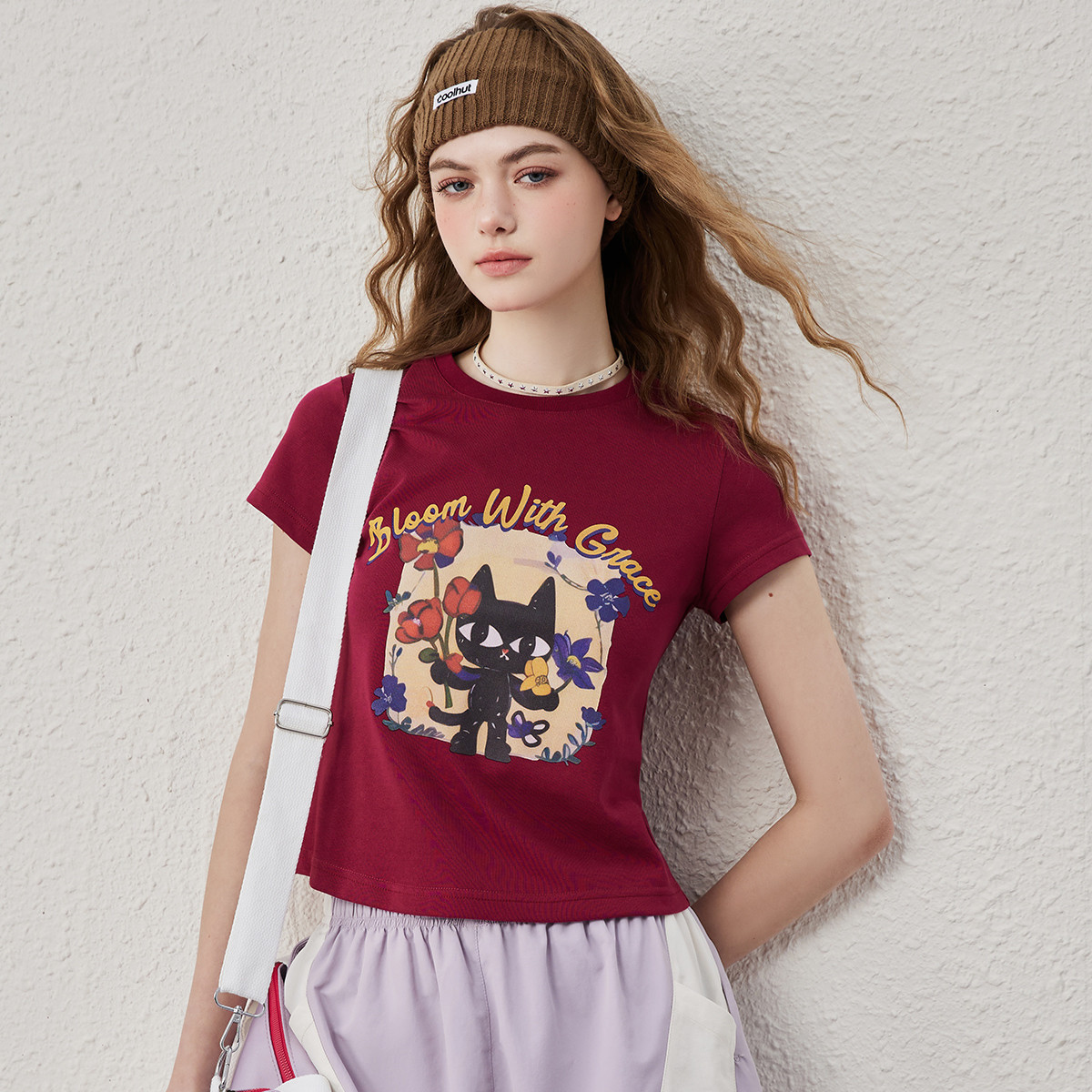 米子旗夏季女印花翻领T恤短款修身简约舒适显瘦短袖上衣 453466