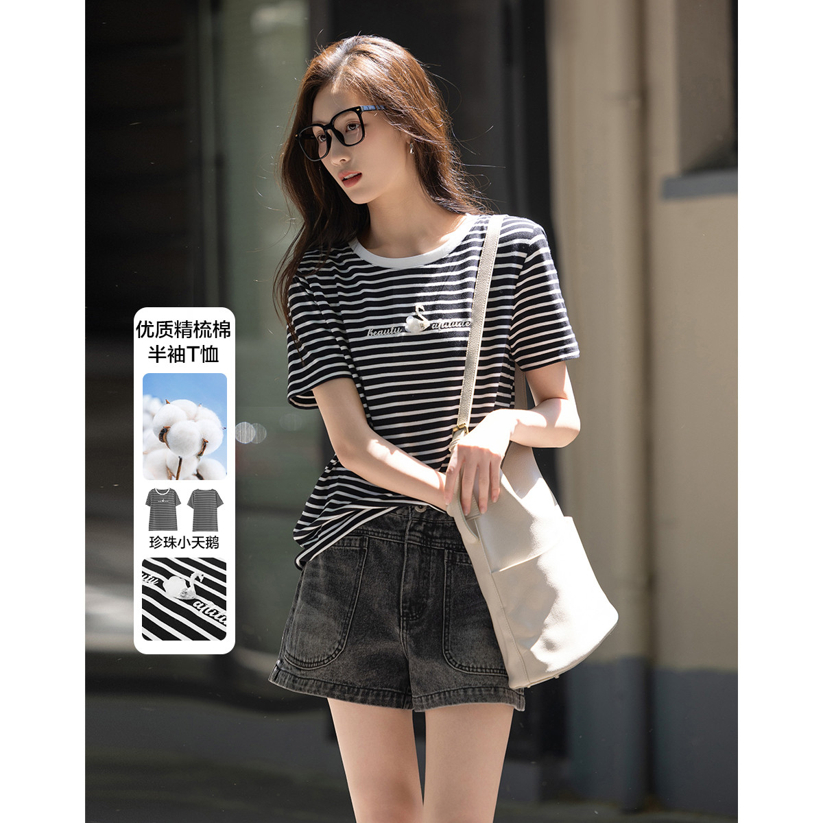 【小天鹅棉氨字母印花T】春秋气质耐看撞色条纹圆领短袖女式t恤 051073