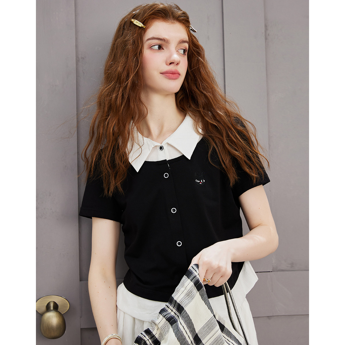 撞色假两件设计感休闲女式T恤夏季减龄收腰百搭短袖上衣 372061
