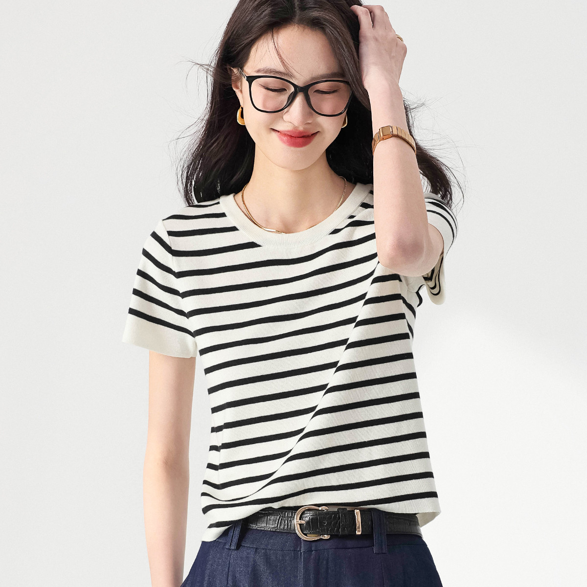 【含桑蚕丝】透气圆领经典条纹针织打底衫短袖T恤 904979