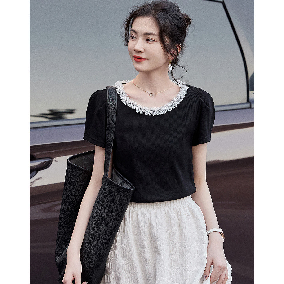【口碑云朵T】夏轻熟风甜美圆领蕾丝泡泡袖短袖显瘦短款女式t恤 727489