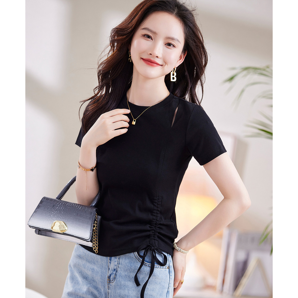 夏季时尚BM风短袖女侧边别致抽绳设计破洞圆领高弹修身t恤 930328