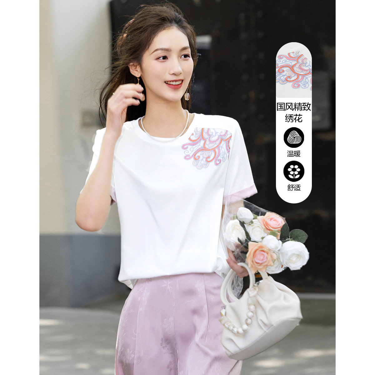 【祥云出袖】夏国风新中式圆领舒适棉宽松重工刺绣短袖女式t恤 034689